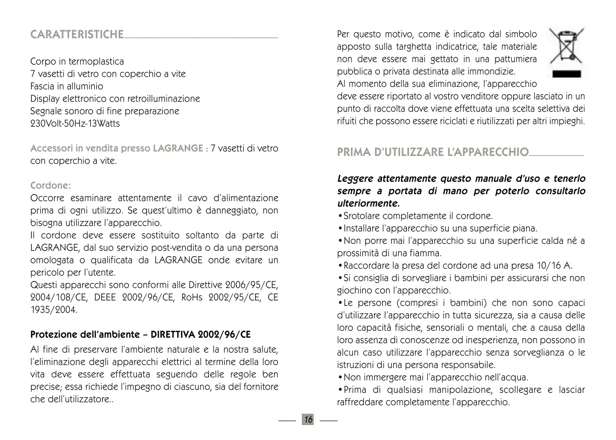 - In caso di guasto, non utilizzato più il vosto appearecchio e contattare il Servizio Post-Vendita LAGRANGE.