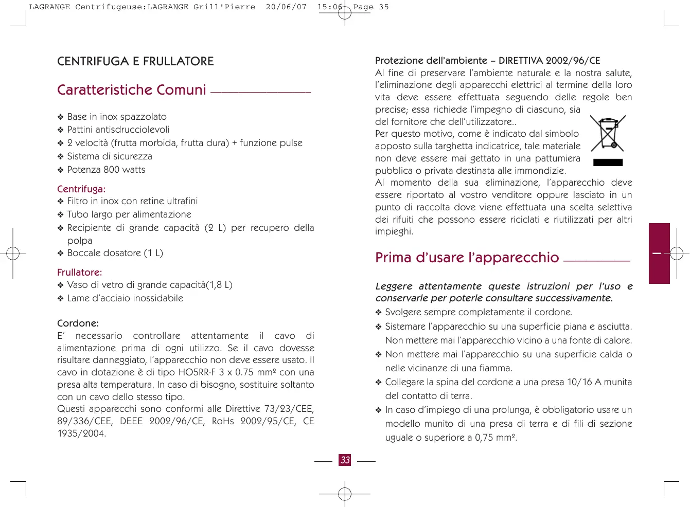 Al fine di preservare l'ambiente naturale e la nostra salute, l'éliminazione degli appearecchi elettrici al termine della loro vita deve essere effettuata seguito delle regole ben