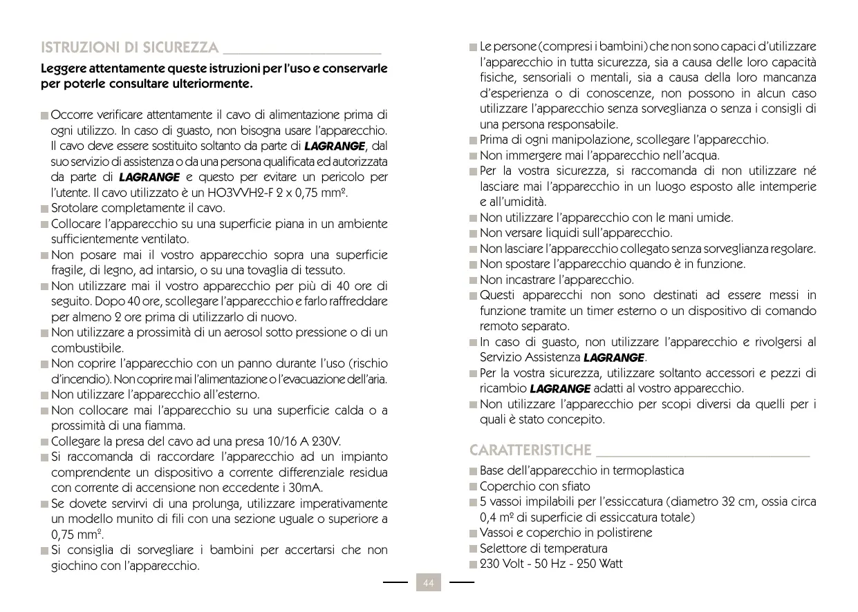PULIZIA_____________________________________ condiZIONI DI GARANZIA____________________ ATTENZIONE: Scollegare l’apparecchio prima della pulizia. Lasciare un periodo di tempo sufficientemente lungo all’apparecchio per raffreddare (circa 30 minuti). Il vostro apparecchio è garantito per 2 anni. Per beneficiare di un’estensione di garanzia gratuita supplementare (www.lagrange.fr). di un anno, occorre registrarsi sul sito La garanzia comprende parti e manodopera e copre i difetti di fabbricazione. Sono esclusi dalla garanzia: danni per uso improprio o mancata osservanza delle istruzioni e rotture dovute a cadute. ase dell’apparecchio: Pulirla con una spugna umida. Non utilizzare tessuti o prodotti aggressivi o abrasivi per preservare la plastica e la sua brillantezza. Attenzione: non immergere mai la base dell’apparecchio né il cavo in acqua. Non metterla mai in lavastoviglie. QUESTA GARANZIA È VALIDA PER UTILIZZI DOMESTICI, IN NESSUN CASO PER UTILIZZI DI TIPO PROFESSIONALE. La garanzia legale a carico del venditore non esclude la garanzia legale da parte del Fabbricante per vizi o difetti di fabbricazione ai sensi degli articoli 1641 e seguenti del Codice Civile. In caso di guasto o malfunzionamento, contattare il vostro rivenditore. In caso di guasto tecnico entro gli 8 giorni successivi all’acquisto, gli apparecchi vengono sostituiti. Trascorso questo termine, essi sono riparati dal Servizio Assistenza