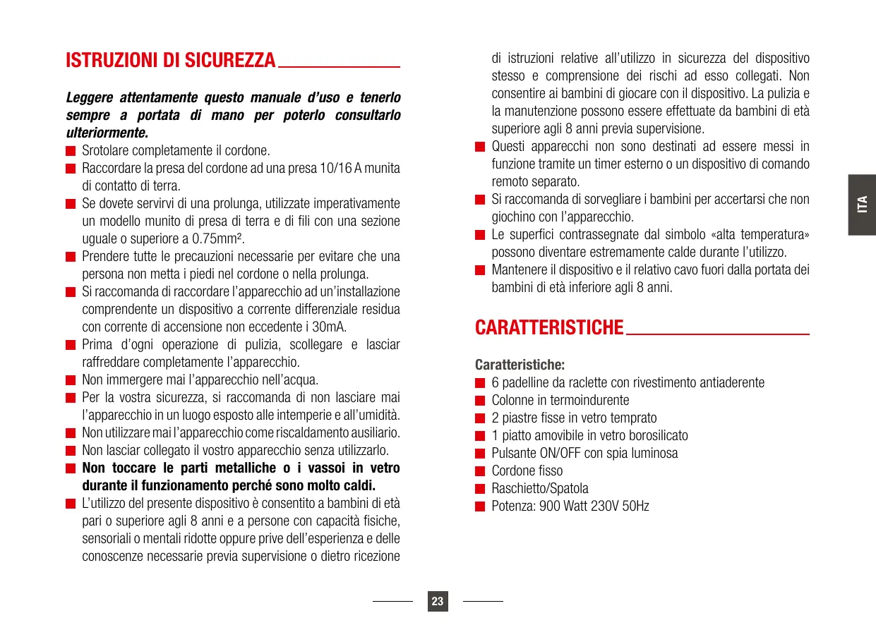 di istruzioni relative all’utilizzo in sicurezza del dispositivo stesso e comprensione dei rischi ad esso collegati. Non consentire ai bambini di giocare con il dispositivo. La pulizia e la manutenzione possono essere effettuate da bambini di età superiore agli 8 anni previa supervisione. Questi apparecchi non sono destinati ad essere messi in funzione tramite un timer esterno o un dispositivo di comando remoto separato. Si raccomanda di sorvegliare i bambini per accertarsi che non giochino con l’apparecchio. Le superfici contrassegnate dal simbolo «alta temperatura» possono diventare estremamente calde durante l’utilizzo. Mantenere il dispositivo e il relativo cavo fuori dalla portata dei bambini di età inferiore agli 8 anni. Caratteristiche Caratteristiche: 6 padelline da raclette con rivestimento antiaderente Colonne in termoindurente 2 piastre fisse in vetro temprato 1 piatto amovibile in vetro borosilicato Pulsante ON/OFF con spia luminosa Cordone fisso Raschietto/Spatola Potenza: 900 Watt 230V 50Hz