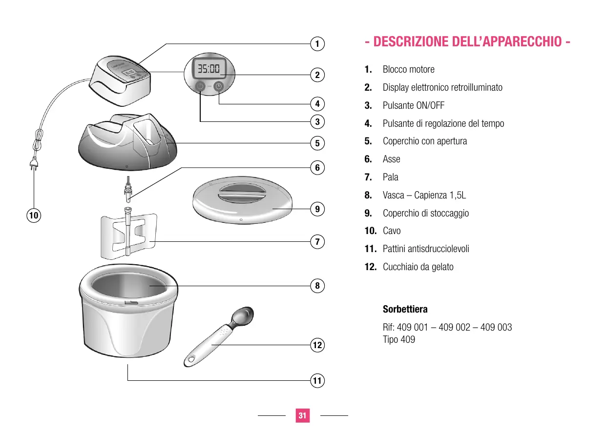 ricambio adatti al vostro apparecchio. In caso di perdita di liquido nella vasca, non usare più l’apparecchio e contattare il servizio Assistenza . Il liquido non è in tuttavia tossico. Non mettere la vasca dell’apparecchio nella lavastoviglie, al forno o al microonde. Non riempire con un liquido di più di 40°C. Evitare ogni contatto con le parti in movimento della sorbettiera. Allontanare mani, capelli, abiti, spatola e altri utensili durante il funzionamento, per evitare ogni rischio di ferite e/o danni all’apparecchio. Non fare funzionare l’apparecchio in un congelatore o refrigeratore. Occorre verificare attentamente il cavo di alimentazione prima di ogni utilizzo. In caso di guasto, non bisogna usare l’apparecchio. Il cavo deve essere sostituito soltanto da parte di dal suo servizio di assistenza o da una persona qualificata ed autorizzata da parte di e questo per evitare un pericolo per l’utente. Il cavo utilizzato è un HO5VV-F 3 G 0,75mm2 Questi apparecchi sono conformi alle direttive 2006/95/CE, 2004/108/CE, DEEE 2002/96/CE, RoHs 2002/95/CE e al regolamento CE contatto alimentare 1935/2004. AMBIENTE CARATTERISTICHE Protezione dell’ambiente – DIRETTIVA 2002/96/CE Per preservare il nostro ambiente e la nostra salute, la distruzione in fin di vita degli apparecchi elettrici deve farsi secondo regole ben precise e richiede la partecipazione attiva di tutti, fornitori od utenti. Questo è il motivo per il quale il vostro apparecchio, come lo indica il simbolo apposto sulla piastrina, non deve in alcun caso essere gettato in una pattumiera pubblica o privata destinata ai rifiuti domestici. Al momento della sua distruzione, vi appartiene di depositare l’apparecchio in un centro di raccolta differenziata pubblica designato per il riciclaggio degli apparecchi elettrici od elettronici. Per ottenere ■ Blocco motore ■ Display elettronico retroilluminato e visualizzazione del tempo