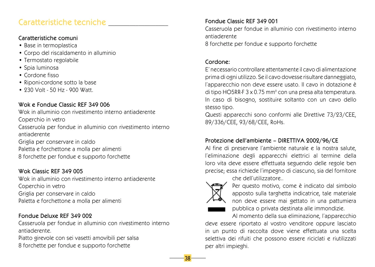 - 230 Volt - 50 Hz - 900 Watt. Cordone: E’ necessario controllare attentamente il cavo di alimentazione prima di ogni utilizzo. Se il cavo dovesse risultare danneggiato, l’apparecchio non deve essere usato. Il cavo in dotazione è di tipo HO5RR-F 3 x 0.75 mm2 con una presa alta temperatura. In caso di bisogno, sostituire soltanto con un cavo dello stesso tipo. Questi apparecchi sono conformi alle Direttive 73/23/CEE, 89/336/CEE, 93/68/CEE, RoHs. Wok e Fondue Classic REF 349 006 Wok in alluminio con rivestimento interno antiaderente Coperchio in vetro Casseruola per fondue in alluminio con rivestimento interno antiaderente Griglia per conservare in caldo Paletta e forchettone a molla per alimenti 8 forchette per fondue e supporto forchette Protezione dell’ambiente – DIRETTIVA 2002/96/CE Al fine di preservare l’ambiente naturale e la nostra salute, l’eliminazione degli apparecchi elettrici al termine della loro vita deve essere effettuata seguendo delle regole ben precise; essa richiede l’impegno di ciascuno, sia del fornitore che dell’utilizzatore.. Per questo motivo, come è indicato dal simbolo apposto sulla targhetta indicatrice, tale materiale non deve essere mai gettato in una pattumiera pubblica o privata destinata alle immondizie. Al momento della sua eliminazione, l’apparecchio deve essere riportato al vostro venditore oppure lasciato in un punto di raccolta dove viene effettuata una scelta selettiva dei rifuiti che possono essere riciclati e riutilizzati per altri impieghi. Wok Classic REF 349 005 Wok in alluminio con rivestimento interno antiaderente Coperchio in vetro Griglia per conservare in caldo Paletta e forchettone a molla per alimenti Fondue Deluxe REF 349 002 Casseruola per fondue in alluminio con rivestimento interno antiaderente. Piatto girevole con sei vasetti amovibili per salsa 8 forchette per fondue e supporto forchette