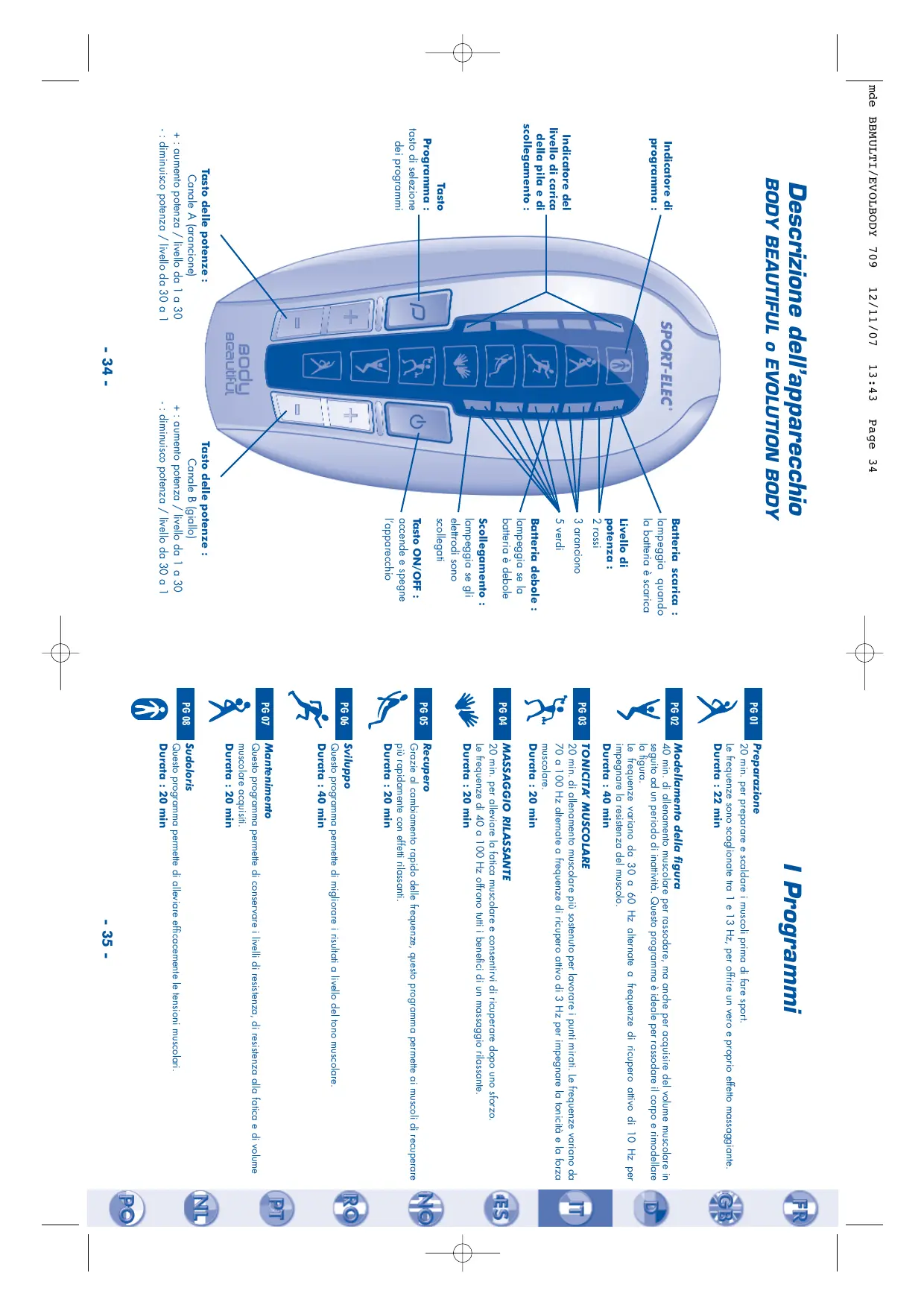 mde BBMULTI/EVOLBODY 709 12/11/07 13:43 Page 34 Descrizione dell’apparecchio Tasto delle potenze : Canale B (giallo) + : aumento potenza / livello da 1 a 30 - : diminuisco potenza / livello da 30 a 1 Tasto ON/OFF : accende e spegne l’apparecchio Scollegamento : lampeggia se gli elettrodi sono scollegati Batteria debole : lampeggia se la batteria è debole 5 verdi 3 aranciono Livello di potenza : 2 rossi Batteria scarica : lampeggia quando la batteria è scarica BODY BEAUTIFUL o EVOLUTION BODY Indicatore di programma : Indicatore del livello di carica della pila e di scollegamento : Tasto Programma : tasto di selezione dei programmi Tasto delle potenze : Canale A (arancione) + : aumento potenza / livello da 1 a 30 - : diminuisco potenza / livello da 30 a 1