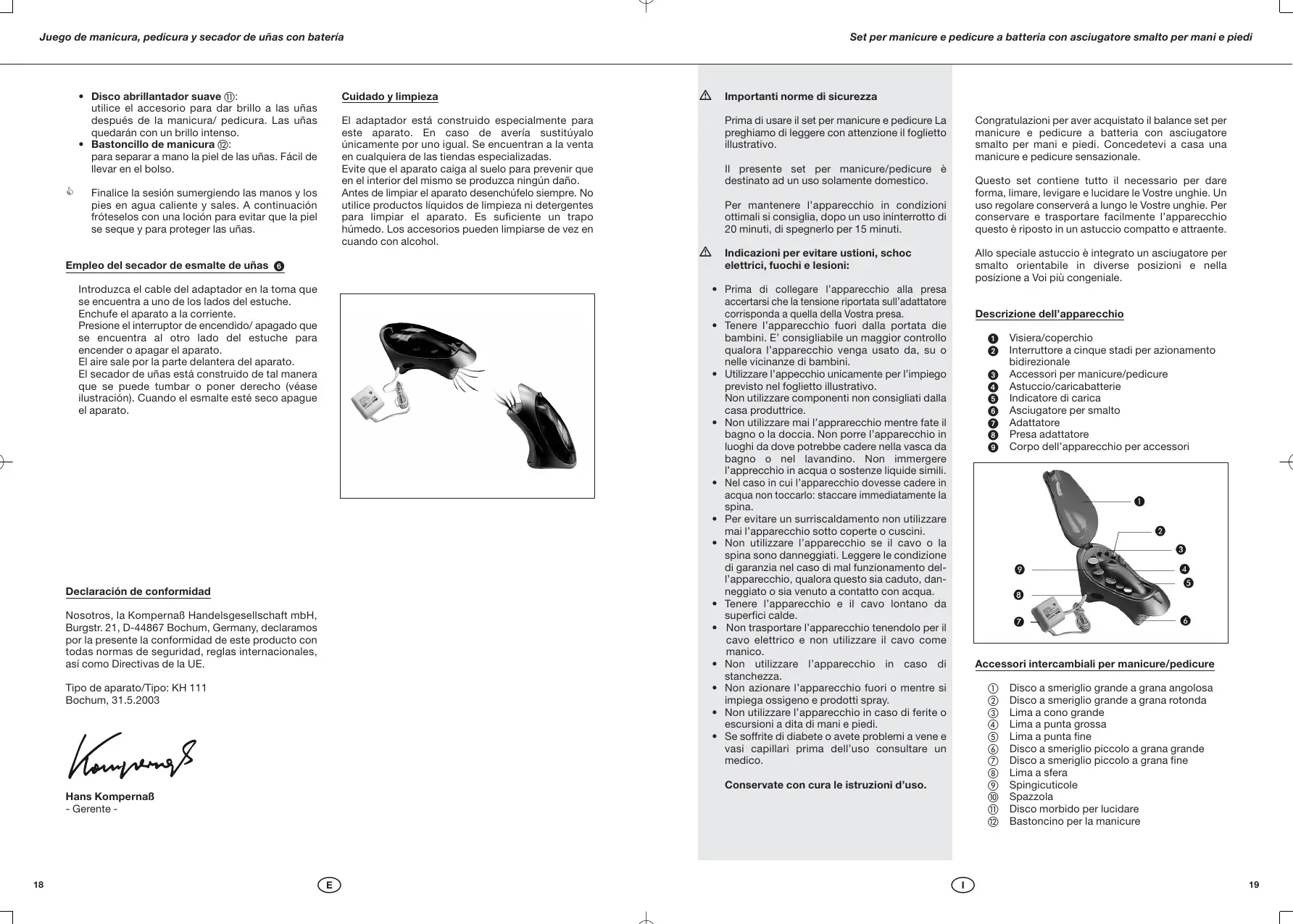 - Spazzola : utilizzate la spazzola per pulire le unghie dopo la lima. La psazzola elimina la pelle dell’unghia in eccesso e prepara l’unghia alla lucidatura. Dichiarazione di conformità Noi, la Kompernaß Handelsgesellschaft mbH, Burgstr. 21, D-44867 Bochum, Germany, dichiariamo che questo apparecchio è conforme a tutte le norme di sicurezza e disposizioni internazionali come anche alle direttive CE applicabili. Tipo di apparecchio/tipo: KH 111 Bochum, 31.5.2003 Hans Kompernaß - Amministratore -