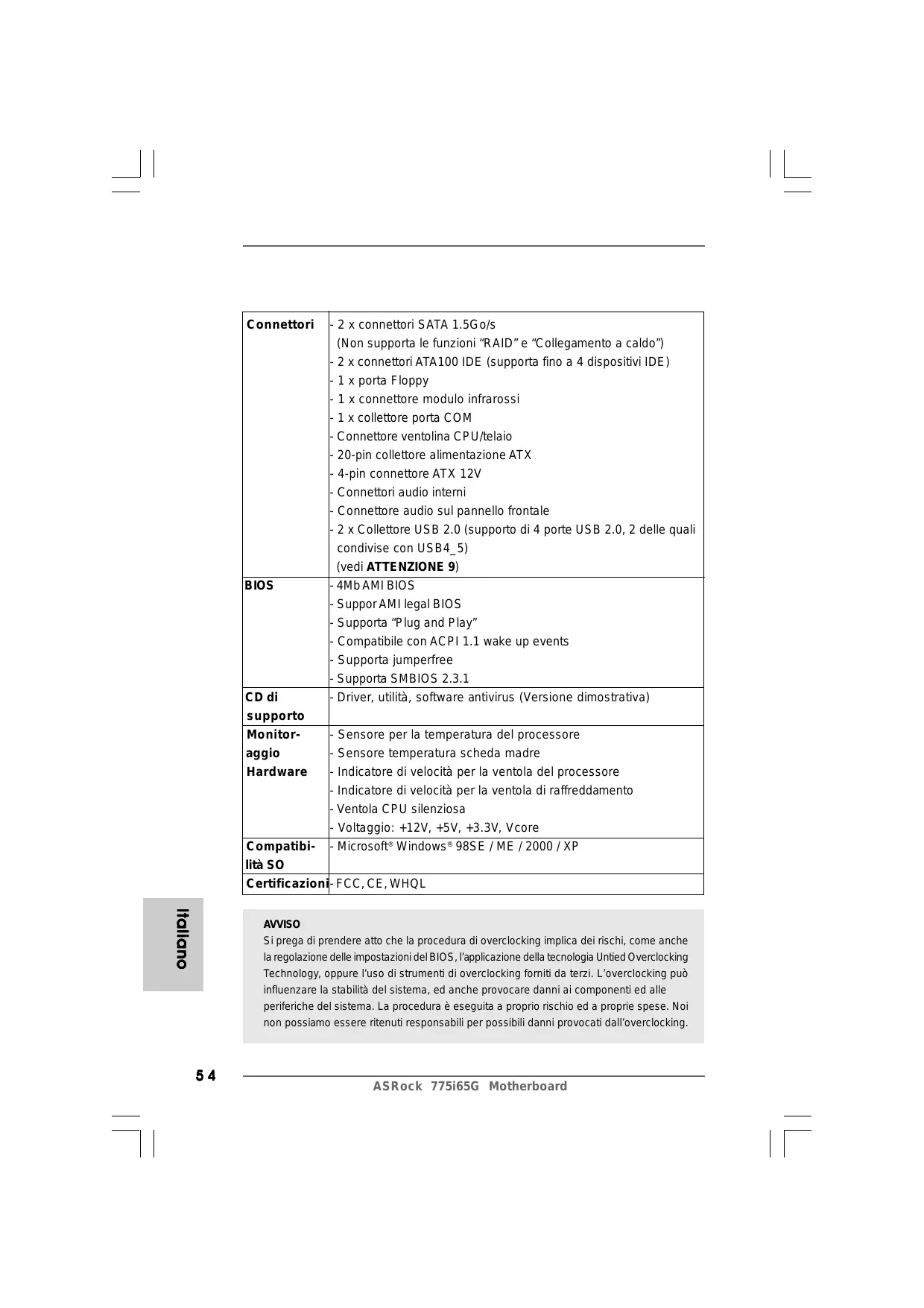 - Quando si utiizza una CPU FSB800 su questa scheda madre, funzionerà a DDR 320 se si adotta un modulo di memoria DDR 333. Anche se questa motherboard offre il controllo stepless, non si consiglia di effettuare l'overclocking. Frequenze del bus del processore diverse da quelle raccomandate possono causare instabilità al sistema o danni al processore e alla scheda madre. Se il processore si surriscalda, il sistema si chiude automaticamente. Prima di riavvire il sistema, assicurarsi che la ventolina CPU della scheda madre funzioni correttamente; scollegare e ricollegare il cavo d'alimentazione. Per migliorare la dissipazione del calore, ricordare di applicare l'apposita pasta siliconica tra il processore e il dissipatore quando si install il sistema. NON usare schede AGP da 3,3 V nello slot AGP di questa motherboard! Cid potrebbe provocare danni permanenti! La Gestione Risorse per USB 2.0 funziona perfettamente con Microsoft® Windows® XP SP1; SP2/2000 SP4. Potrebbe dare qualche problema con Microsoft” Windows” 98/ME.. Italiano ASRock 775i65G Motherboard 55