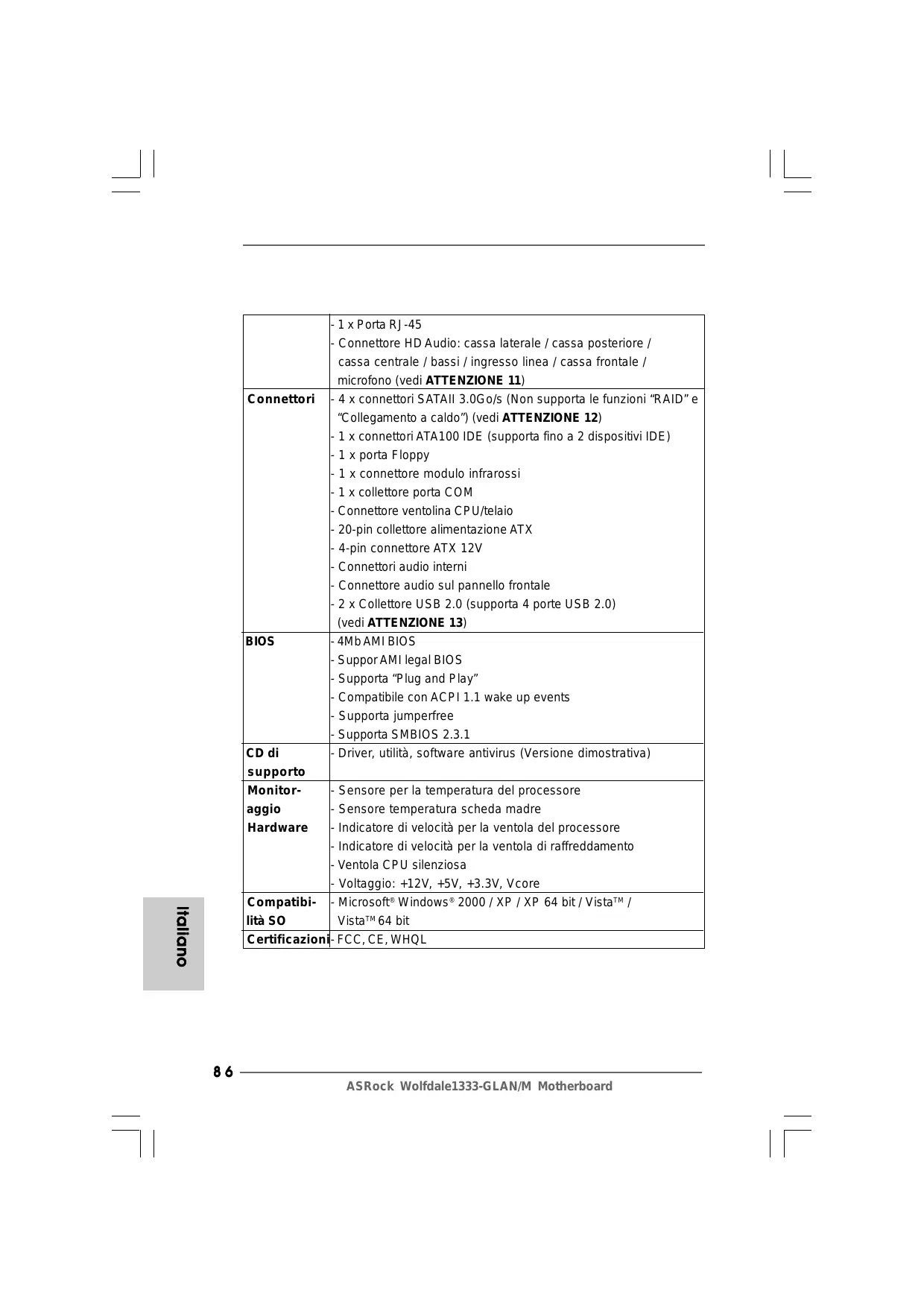 - 1 x Porta RJ-45 | Connettore HD Audio: cassa laterale / cassa posteriore / cassa centrale / bassi / ingresso linea / cassa frontale / microfono (vedi ATTENZIONE 11) Connettori [ 4 x connettori SATAII 3.0Go/s (Non supporta le funzioni "RAID" e “Collegamento a caldo”) (vedi ATTENZIONE 12) L 1 x connettori ATA100 IDE (supporta fino a 2 dispositivi IDE) 1 x porta Floppy | 1 x connettore modulo infrarossi : 1 x collettore porta COM | Connettore ventolina CP U/telaio | 20-pin collettore alimentazione ATX | 4-pin connettore ATX 12V | Connettori audio interni | Connettore audio sul pannello frontale : 2 x Collettore USB 2.0 (supporta 4 porte USB 2.0) {vedi ATTENZIONE 13) BIOS - 4Mb AMI BIOS | Suppor AMI legal BIOS | Supporta “Plug and Play” | Compatibile con ACPI 1.1 wake up events | Supporta jumperfree | Supporta SMBIOS 2.3.1 CD di supporto | Driver, utilità, software antivirus (Versione dimostrativa) Monitor- aggio Hardware | Sensore per la temperatura del processore | Sensore temperatura scheda madre | Indicatore di velocità per la ventola del processore L Indicatore di velocità per la ventola di raffreddamento | Ventola CPU silenziosa | Voltaggio: +12V, +5V, +3.3V, Vcore Compatibi- lità SO |- Microsoft® Windows® 2000 / XP / XP 64 bit/ Vistaï" / Vista" 64 bit Certificazion