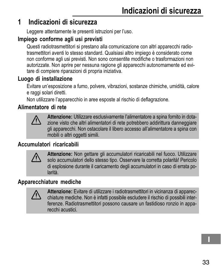 Attenzione: Evitare di utilizzare i radiotrasmettitori in vicinanza di apparecchiature mediche. Non è infatti possibile escludere il rischio di possibili interferenze. Radiotrasmettitori sono causare un fastidioso ronzio in apperecchi acustici.