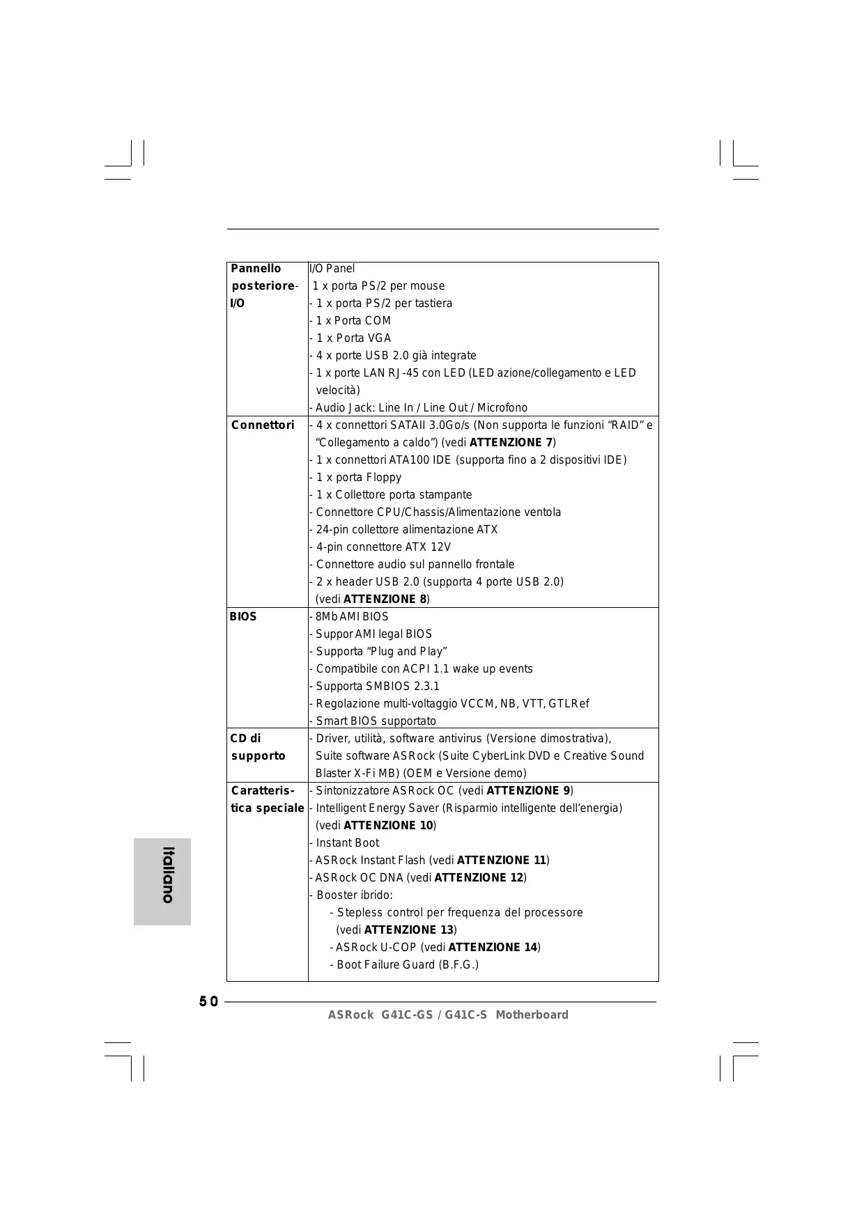 ASRock G41C-GS / G41C-S Motherboard Italiano Pannello I/O Panel posteriore- 1 x porta PS/2 per mouse I/O - 1 x porta PS/2 per tastiera - 1 x Porta COM - 1 x Porta VGA - 4 x porte USB 2.0 già integrate - 1 x porte LAN RJ-45 con LED (LED azione/collegamento e LED velocità) - Audio Jack: Line In / Line Out / Microfono Connettori - 4 x connettori SATAII 3.0Go/s (Non supporta le funzioni “RAID” e “Collegamento a caldo”) (vedi ATTENZIONE 7) - 1 x connettori ATA100 IDE (supporta fino a 2 dispositivi IDE) - 1 x porta Floppy - 1 x Collettore porta stampante - Connettore CPU/Chassis/Alimentazione ventola - 24-pin collettore alimentazione ATX - 4-pin connettore ATX 12V - Connettore audio sul pannello frontale - 2 x header USB 2.0 (supporta 4 porte USB 2.0) (vedi ATTENZIONE 8) BIOS - 8Mb AMI BIOS - Suppor AMI legal BIOS - Supporta “Plug and Play” - Compatibile con ACPI 1.1 wake up events - Supporta SMBIOS 2.3.1 - Regolazione multi-voltaggio VCCM, NB, VTT, GTLRef - Smart BIOS supportato CD di - Driver, utilità, software antivirus (Versione dimostrativa), supporto Suite software ASRock (Suite CyberLink DVD e Creative Sound Blaster X-Fi MB) (OEM e Versione demo) Caratteris- - Sintonizzatore ASRock OC (vedi ATTENZIONE 9) tica speciale - Intelligent Energy Saver (Risparmio intelligente dell’energia) (vedi ATTENZIONE 10) - Instant Boot - ASRock Instant Flash (vedi ATTENZIONE 11) - ASRock OC DNA (vedi ATTENZIONE 12) - Booster ibrido: - Stepless control per frequenza del processore (vedi ATTENZIONE 13) - ASRock U-COP (vedi ATTENZIONE 14) - Boot Failure Guard (B.F.G.)