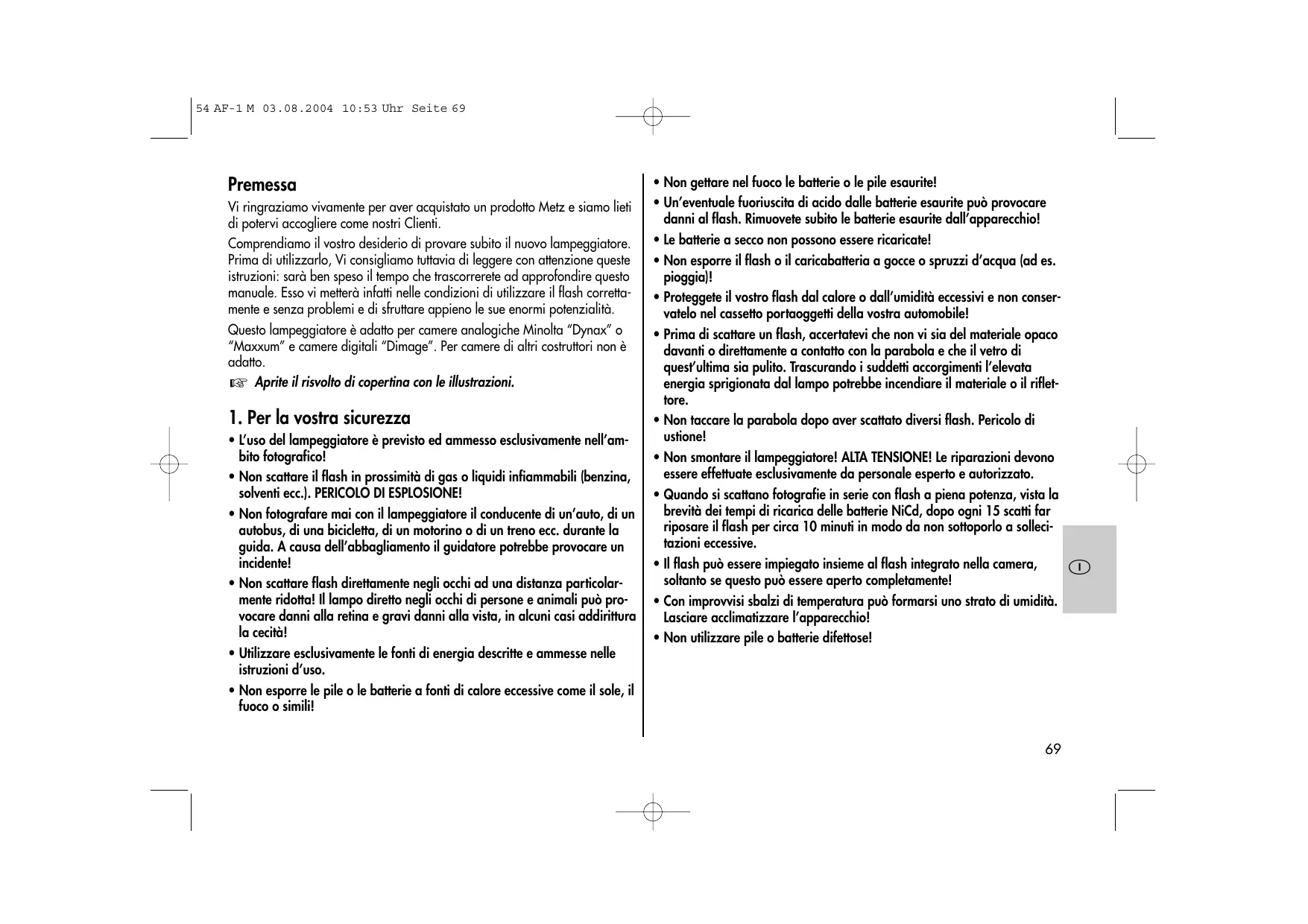 54 AF-1M 03.08.2004 10:53 Uhr Seite 69 Premessa Vi ringraziamo vivamente per aver acquistato un prodotto Metz e siamo lieti di potervi accogliere come nostri Clienti. Comprendiamo il vostro desiderio di provare subito il nuovo lampeggiatore. Prima di utilizzarlo, Vi consigliamo tuttavia di leggere con attenzione queste istruzioni: sarà ben speso il tempo che trascorrerete ad approfondire questo manuale. Esso vi metterà infatti nelle condizioni di utilizzare il lash corretta- mente e senza problemi e di sfruttare appieno le sue enormi potenzialità: Questo lampeggiatore à adatto per camere analogiche Minolta “Dynax” o “Maxxum” e camere digitali “Dimage”. Per camere di aliri costruttori non à adaïto. 15 Aprite il risvolto di copertina con le illustrazioni.