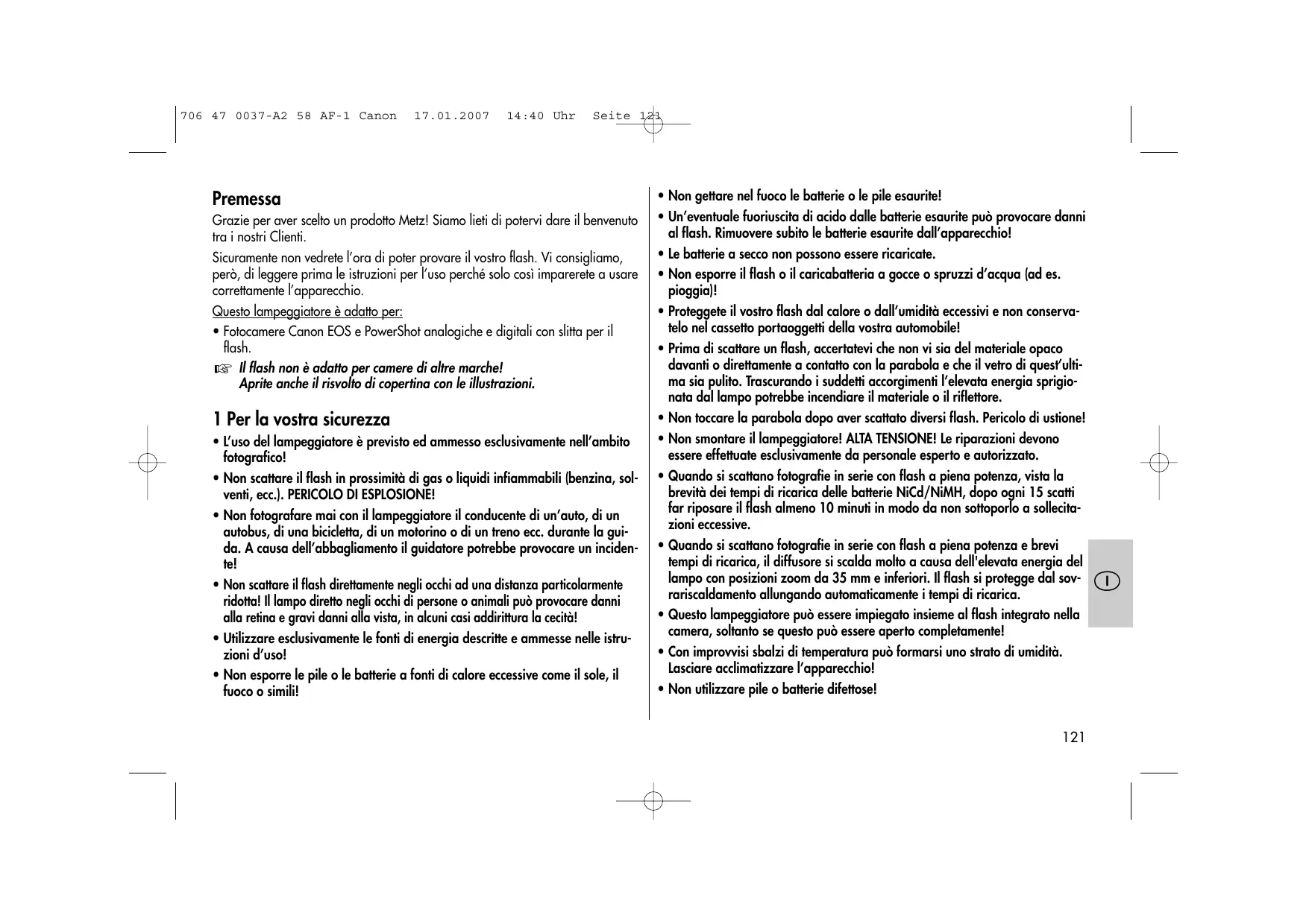 I cattivo funzionamento e i danni eventualmente provocati al flash dall'utilizzo di accessori non prodotti alla Metz non sono coperti alla notre garanzia!