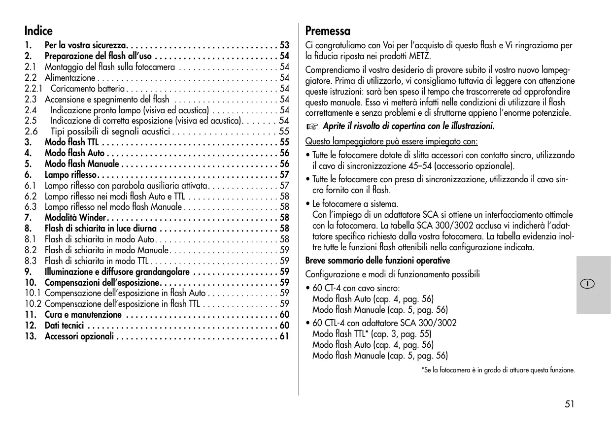 - 60 CTL-4 con adattatore SCA 300/3002 Modo flash TTL* (cap. 3, pag. 55) Modo flash Auto (cap. 4, pag. 56) Modo flash Manuale (cap. 5, pag. 56) *Se la fotocamera è in grado di attuare questa funzione.
