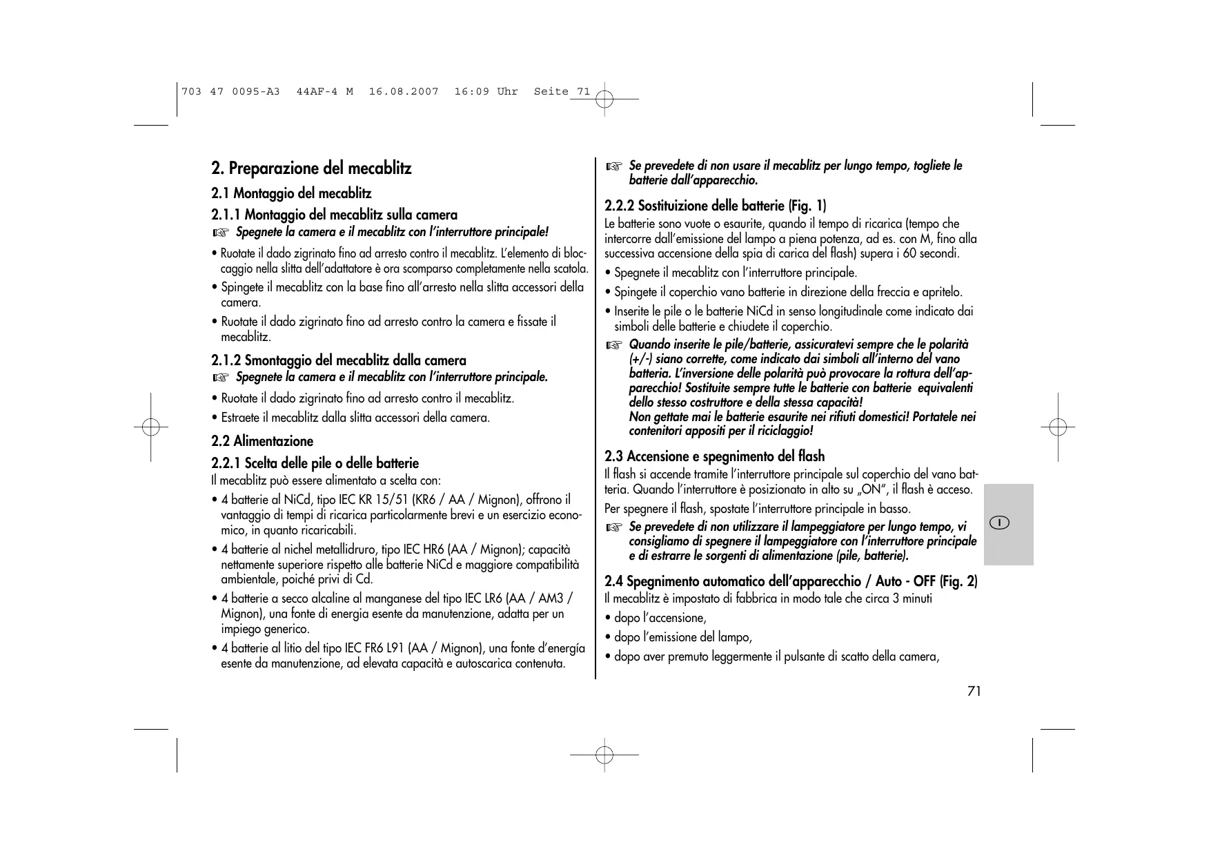 + Non gettare nel fuoco le batterie o le pile esaurite! + Un’eventuale fuoriuscita di acido dalle batterie esaurite pud provocare danni al flash. Rimuovete subito le batterie esaurite dall’apparecchio! + Le batterie a secco non possono essere ricaricate! + Non esporre il flash o il caricabatteria a gocce o spruzzi d'acqua [ad es. pioggia + Proteggete il vostro flash dal calore o dall’umidità eccessivi e non conser- vatelo nel cassetto portaoggetti della vostra automobile! + Prima di scattare un flash, accertatevi che non vi sia del materiale opaco davanti o direttamente a contatto con la parabola e che il vetro di quesf’ultima sia pulito. Trascurando i suddeti accorgimenti l'elevata energia sprigionata dal lampo potrebbe incendiare il materiale o il riflet- tore. + Non taccare la parabola dopo aver scattato diversi flash. Pericolo di ustione! + Non smontare il lampeggiatore! ALTA TENSIONE! Le riparazioni devono essere effettuate esclusivamente da personale esperto e autorizzato. + Quando si scattano fotografie in serie con flash a piena potenza, vista la brevità dei tempi di ricarica delle batterie NiCd, dopo ogni 15 scatti far riposare il flash per circa 10 minuti in modo da non sottoporlo a solleci- tazioni eccessive. + 1] mecablitz pud essere impiegato insieme al flash integrato nella camera, soltanto se questo puè essere aperto completamente! + Con improwvisi sbalzi di temperatura puè formarsi uno strato di umidità. Lasciare acclimatizzare l'apparecchi