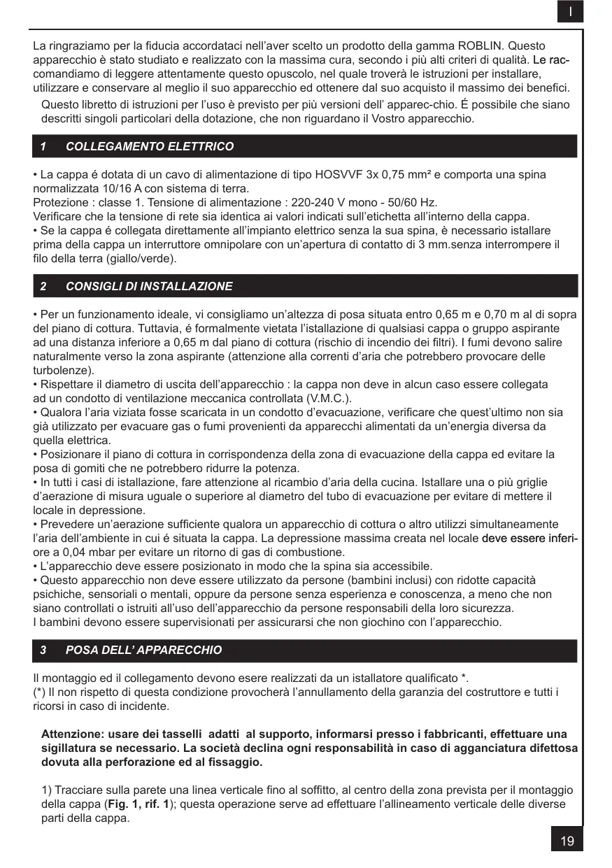 La ringraziamo per la fiducia accordataci nell’aver scelto un prodotto della gamma ROBLIN. Questo apparecchio è stato studiato e realizzato con la massima cura, secondo i più alti criteri di qualità. Le raccomandiamo di leggere attentamente questo opuscolo, nel quale troverà le istruzioni per installare, utilizzare e conservare al meglio il suo apparecchio ed ottenere dal suo acquisto il massimo dei benefici. Questo libretto di istruzioni per l’uso è previsto per più versioni dell’ apparec-chio. É possibile che siano descritti singoli particolari della dotazione, che non riguardano il Vostro apparecchio.