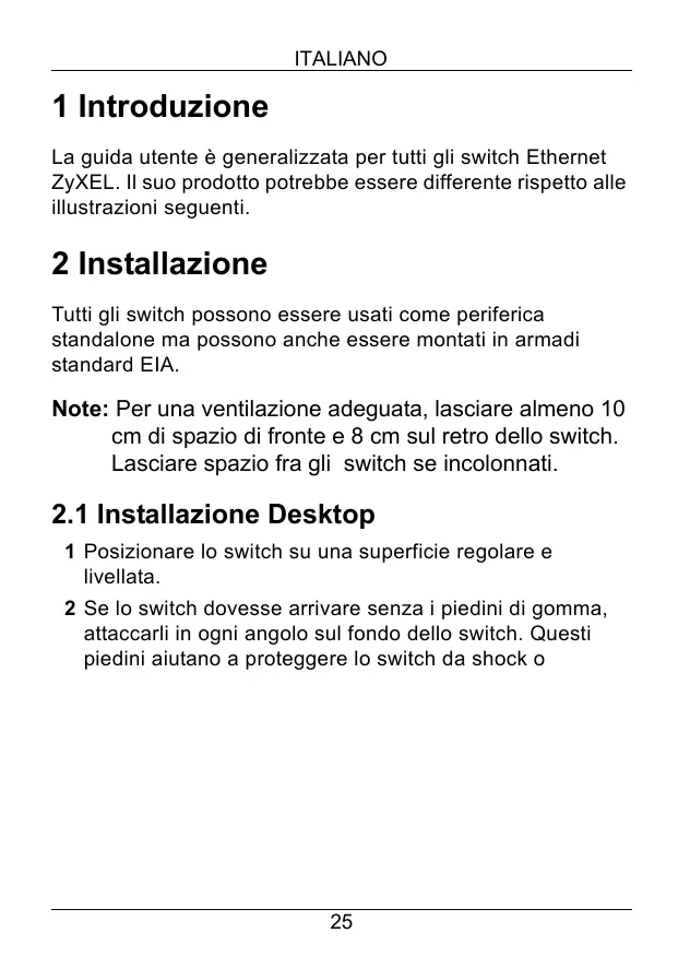 2.1 Installazione Desktop 1 Posizionare lo switch su una superficie regolare e livellata. 2 Se lo switch dovesse arrivare senza i piedini di gomma,