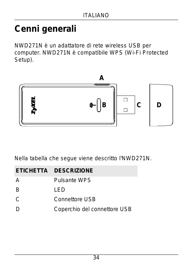 ETICHETTA DESCRIZIONE A Pulsante WPS B LED C Connettore USB D Coperchio del connettore USB