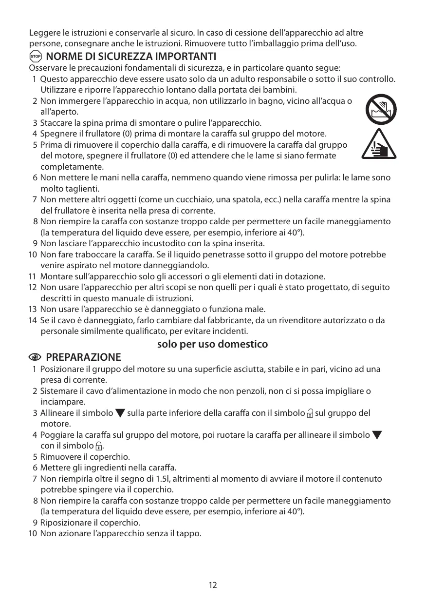 Leggere le istruzioni e conservarle al sicuro. In caso di cessione dell'apparecchio ad altre persone, consegnare anche le istruzioni. Rimuovere tutto l'imballaggio prima dell'uso. NORME DI SICUREZZA IMPORTANTI Osservare le precauzioni fondamentali di sicurezza, e in particolare quanto segue: 1 Questo apparecchio deve essere usato solo da un adulto responsabile o sotto il suo controllo. Utilizzare e riporre l'apparecchio lontano dalla portata dei bambini 2 Non immergere l'apparecchio in acqua, non utilizzarlo in bagno, vicino all’acqua o all'aperto. KR) 3 Staccare la spina prima di smontare o pulire l'apparecchio. 4 Spegnere il frullatore (0) prima di montare la caraffa sul gruppo del motore. 5 Prima di rimuovere il coperchio dalla caraffa, e di rimuovere la caraffa dal gruppo del motore, spegnere il frullatore (0) ed attendere che le lame si siano fermate completamente. 6 Non mettere le mani nella caraffa, nemmeno quando viene rimossa per pulirla: le lame sono molto taglienti. 7 Non mettere altri oggetti (come un cucchiaio, una spatola, ecc.) nella caraffa mentre la spina del frullatore è inserita nella presa di corrente. 8 Non riempire la caraffa con sostanze troppo calde per permettere un facile maneggiamento la temperatura del liquido deve essere, per esempio, inferiore ai 40°). 9 Non lasciare l'apparecchio incustodito con la spina inserita. 10 Non fare traboccare la caraffa. Se il liquido penetrasse sotto il gruppo del motore potrebbe venire aspirato nel motore danneggiandolo. 11 Montare sull’apparecchio solo gli accessori o gli elementi dati in dotazione. 12 Non usare l'apparecchio per altri scopi se non quelli per i quali è stato progettato, di seguito descritti in questo manuale di istruzioni. 13 Non usare l'apparecchio se à danneggiato o funziona male. 14 Seil cavo è danneggiato, farlo cambiare dal fabbricante, da un rivenditore autorizzato o da personale similmente qualificato, per evitare incidenti.