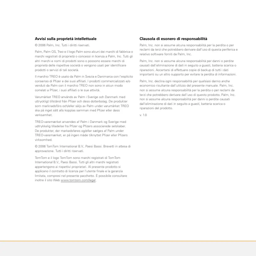 Avvisi sulla proprietà intellettuale Clausola di esonero di responsabilità © 2006 Palm, Inc. Tutti i diritti riservati. Palm, Inc. non si assume alcuna responsabilità per la perdita o per reclami da terzi che potrebbero derivare dall'uso di questa periferica e relativo software forniti da Palm, Inc. Palm, Palm OS, Treo e il logo Palm sono alcuni dei marchi di fabbrica o marchi registrati di proprietà o concessi in licenza a Palm, Inc. Tutti gli altri marchi e nomi di prodotti sono o possono essere marchi di proprietà delle rispettive società o vengono usati per identificare prodotti o servizi di tali società. Il marchio TREO è usato da Palm in Svezia e Danimarca con l'esplicito consenso di Pfizer e dei suoi affiliati. I prodotti commercializzati e/o venduti da Palm con il marchio TREO non sono in alcun modo correlati a Pfizer, i suoi affiliati o le sue attività. Varumärket TREO används av Palm i Sverige och Danmark med uttryckligt tillstånd från Pfizer och dess dotterbolag. De produkter som marknadsförs och/eller säljs av Palm under varumärket TREO ska på inget sätt alls kopplas samman med Pfizer eller dess verksamhet. TREO-varemærket anvendes af Palm i Danmark og Sverige med udtrykkelig tilladelse fra Pfizer og Pfizers associerede selskaber. De produkter, der markedsføres og/eller sælges af Palm under TREO-varemærket, er på ingen måde tilknyttet Pfizer eller Pfizers virksomhed. © 2006 TomTom International B.V., Paesi Bassi. Brevetti in attesa di approvazione. Tutti i diritti riservati. TomTom e il logo TomTom sono marchi registrati di TomTom International B.V., Paesi Bassi. Tutti gli altri marchi registrati appartengono ai rispettivi proprietari. Al presente prodotto si applicano il contratto di licenza per l'utente finale e la garanzia limitata, compresi nel presente pacchetto. È possibile consultare inoltre il sito Web www.tomtom.com/legal. Palm, Inc. non si assume alcuna responsabilità per danni o perdite causati dall'eliminazione di dati in seguito a guasti, batteria scarica o riparazioni. Accertarsi di effettuare copie di backup di tutti i dati importanti su un altro supporto per evitare la perdita di informazioni. Palm, Inc. declina ogni responsabilità per qualsiasi danno anche economico risultante dall'utilizzo del presente manuale. Palm, Inc. non si assume alcuna responsabilità per la perdita o per reclami da terzi che potrebbero derivare dall'uso di questo prodotto. Palm, Inc. non si assume alcuna responsabilità per danni o perdite causati dall'eliminazione di dati in seguito a guasti, batteria scarica o riparazioni del prodotto.