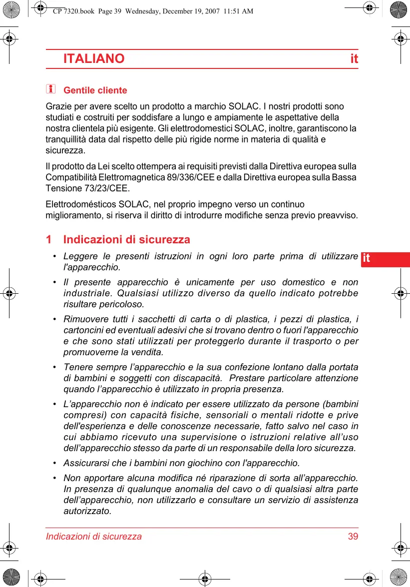 Grazie per avere scelto un prodotto a marchio SOLAC. I nostri prodotti sono studiati e costruiti per soddisfare a lungo e ampiamente le aspettative della nostra clientela più esigente. Gli elettrodomestici SOLAC, inoltre, garantisco la tranquilità data dal rispetto delle più rigide norme in materia di qualità e sicurezza.