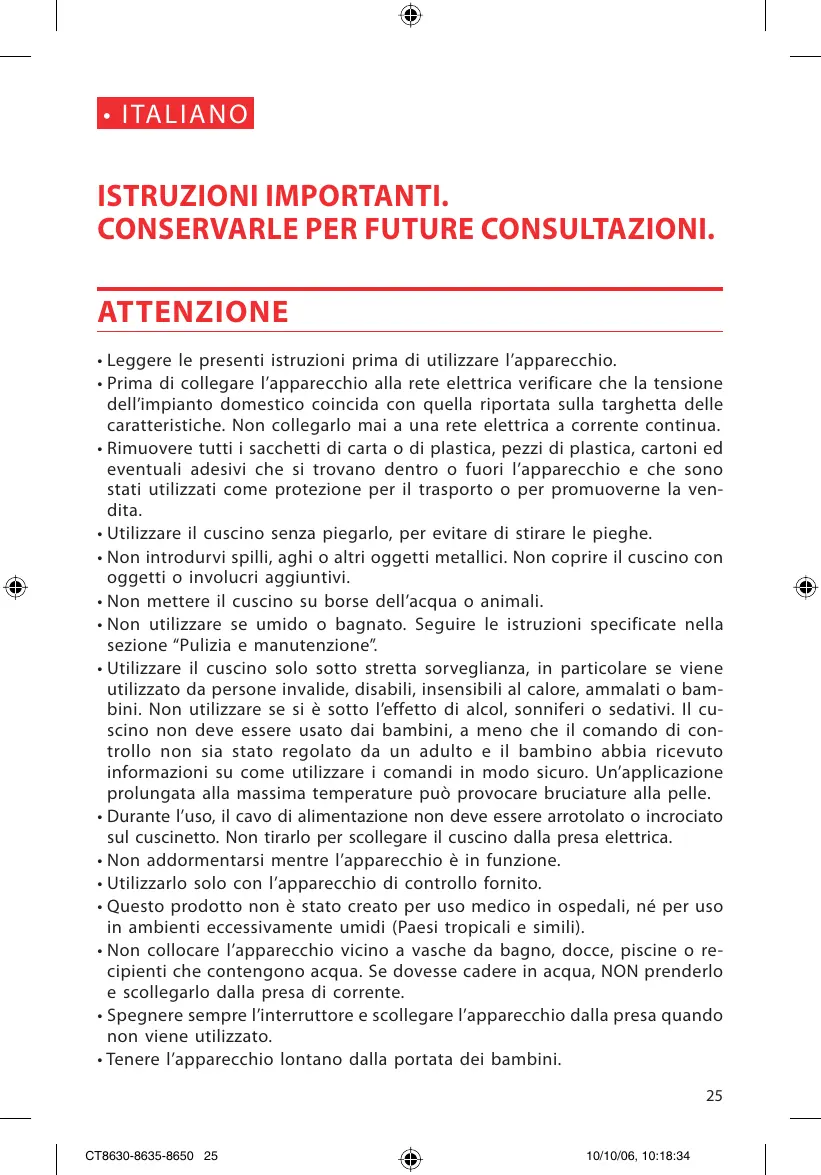 Scarica le istruzioni per il tuo Cuscino elettrico in formato PDF gratuitamente! Trova il tuo manuale CT8635 - SOLAC e riprendi in mano il tuo dispositivo elettronico. In questa pagina sono pubblicati tutti i documenti necessari per l'utilizzo del tuo dispositivo. CT8635 del marchio SOLAC.