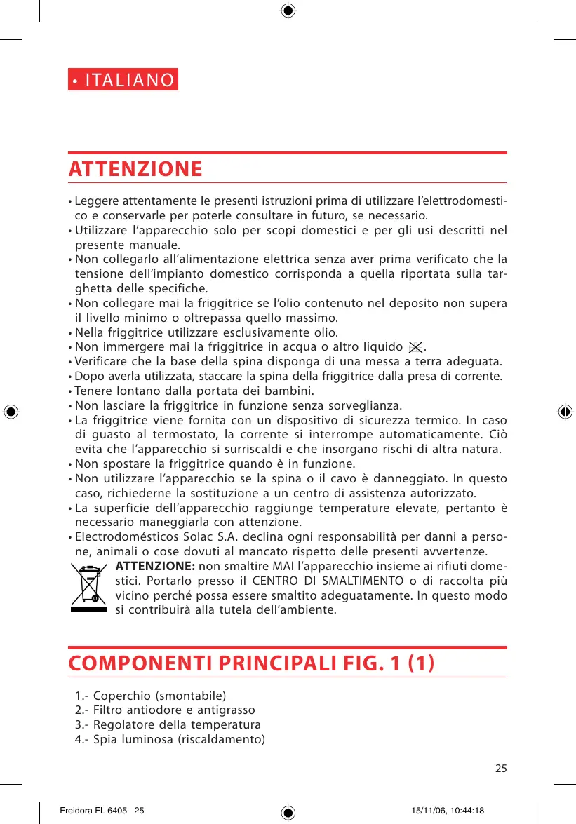 ATTENZIONE + Leggere attentamente le presenti istruzioni prima di utilizzare l'elettrodomesti- co e conservarle per poterle consultare in futuro, se necessario. + Utilizzare l'apparecchio solo per scopi domestici e per gli usi descritti nel presente manuale. + Non collegarlo all'alimentazione elettrica senza aver prima verificato che la tensione dell'impianto domestico corrisponda a quella riportata sulla tar- ghetta delle specifiche. + Non collegare mai la friggitrice se l'olio contenuto nel deposito non supera il livello minimo o oltrepassa quello massimo. + Nella friggitrice utilizzare esclusivamente olio. + Non immergere mai la friggitrice in acqua o altro liquido X. + Verificare che la base della spina disponga di una messa a terra adeguata. + Dopo averla utilizzata, staccare la spina della friggitrice dalla presa di corrente. + Tenere lontano dalla portata dei bambini. + Non lasciare la friggitrice in funzione senza sorveglianza. La friggitrice viene fornita con un dispositivo di sicurezza termico. In caso di guasto al termostato, la corrente si interrompe automaticamente. Cid evita che l'apparecchio si surriscaldi e che insorgano rischi di altra natura. + Non spostare la friggitrice quando à in funzione. + Non utilizzare l'apparecchio se la spina o il cavo à danneggiato. In questo caso, richiederne la sostituzione a un centro di assistenza autorizzato. + La superficie dell'apparecchio raggiunge temperature elevate, pertanto à necessario maneggiarla con attenzione. + Electrodomésticos Solac S.A. declina ogni responsabilità per danni a perso- ne, animali o cose dovuti al mancato rispetto delle presenti avvertenze. ATTENZIONE: non smaltire MAI l'apparecchio insieme ai rifiuti dome- stici. Portarlo presso il CENTRO DI SMALTIMENTO o di raccolta più vicino perché possa essere smaltito adeguatamente. In questo modo — si contribuirà alla tutela dell'ambiente. COMPONENTI PRINCIPALI FIG. 1 (1) 1 Coperchio (smontabile) 2.- Filtro antiodore e antigrasso 3.- Regolatore della temperatura