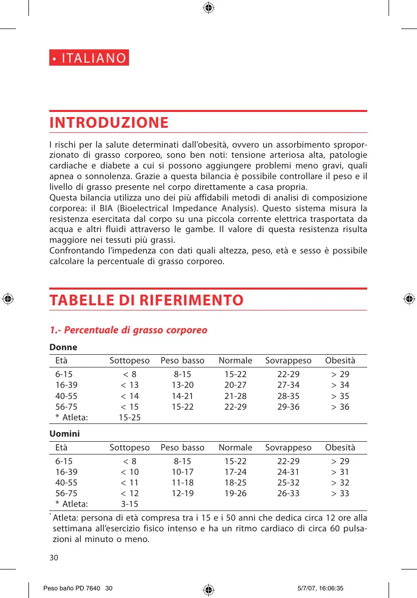 KO] ITALIAN INTRODUZIONE I rischi per la salute determinati dall'obesità, ovvero un assorbimento spropor- Zionato di grasso corporeo, sono ben noti: tensione arteriosa alta, patologie cardiache e diabete a cui si possono aggiungere problemi meno gravi, quali apnea o sonnolenza. Grazie a questa bilancia à possibile controllare il peso e il livello di grasso presente nel corpo direttamente a casa propria. Questa bilancia utilizza uno dei più affidabili metodi di analisi di composizione corporea: il BIA (Bioelectrical Impedance Analysis). Questo sistema misura la resistenza esercitata dal corpo su una piccola corrente elettrica trasportata da acqua e altri fluidi attraverso le gambe. Il valore di questa resistenza risulta maggiore nei tessuti più grassi. Confrontando l'impedenza con dati quali altezza, peso, età e sesso à possibile calcolare la percentuale di grasso corporeo.