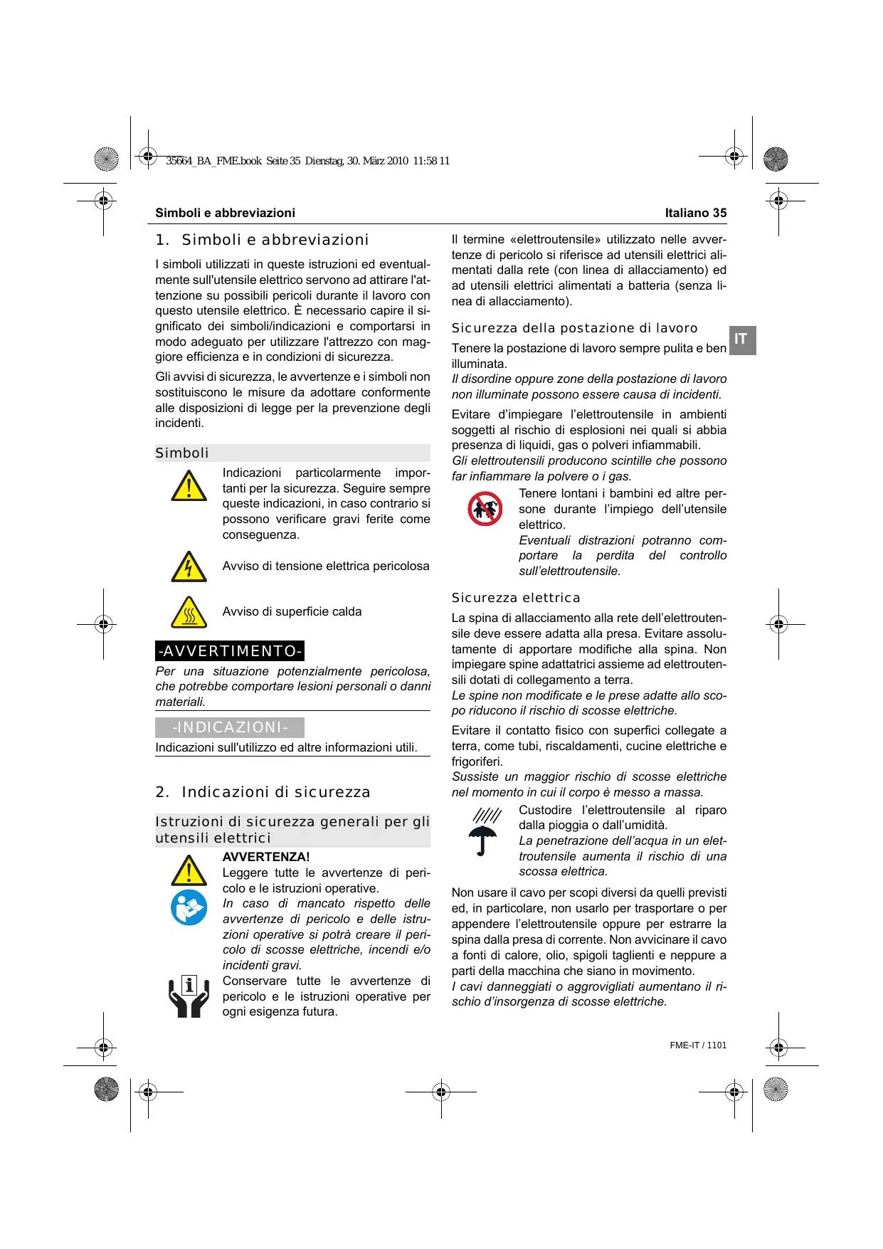 La quasi-macchina è conforme alle norme stabilite nelle Direttive Materiale elettrico destinato ad essere adoperato entro taluni limiti di tensione (2006/95/CE) e Compatibilità elettromagnetica 2004/108/CE/EMC. È consentito mettere in servizio la quasi-macchina solo esclusivamente dopo essersi scrupolosamente accertati che la macchina, nella quale la quasi-macchina deve essere montata, è conforme ai sensi della Direttiva Macchine (2006/42/CE). Il costruttore si impegna a mettere a disposizione in formato elettronico su richiesta di enti nazionali la speciale documentazione relativa alla quasi-macchina. Ai sensi dell'allegato VII, sezione B, si dichiara che la documentazione tecnica speciale relativa alla quasi-macchina è stata redatta. Nominativi dei responsabili autorizzati alla redazione della documentazione: Klemens Müller, Wolfgang Auch Recapito dei responsabili autorizzati alla redazione della documentazione: vedi indirizzo del costruttore Bisingen, Marzo 2010 In data Marzo 2010 In data FME-IT / 1101 Klemens Müller - Quality & Process Representative - Firma Wolfgang Auch - Technical Director - Firma 35664_BA_FME.book Seite 45 Dienstag, 30. März 2010 11:58 11 Manual original “Motor de fresado y amolado“ Símbolos y abreviaturas