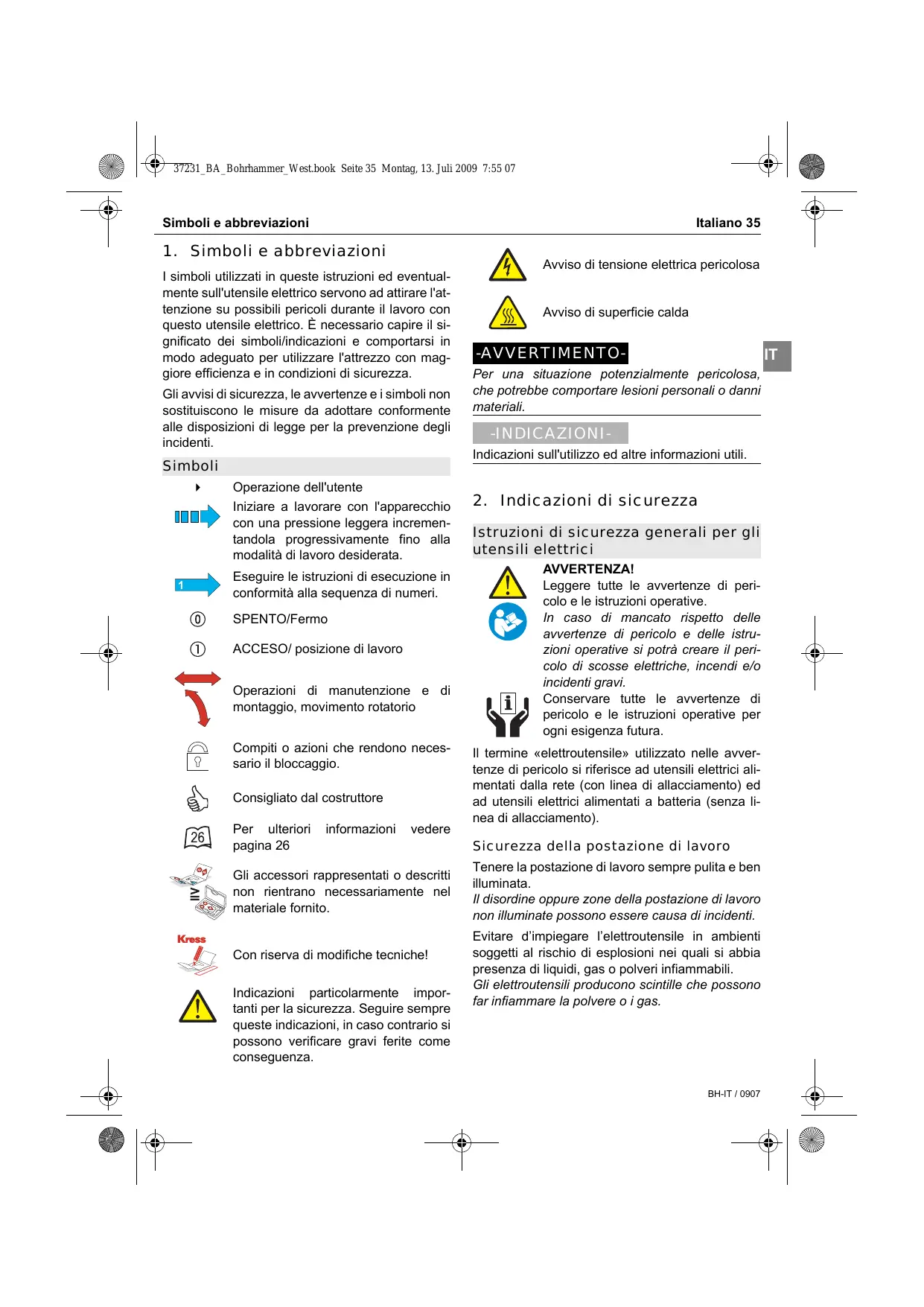 Istruzioni di sicurezza generali per gli utensili elettrici AVVERTENZA! Leggere tutte le avvertenze di pericolo e le istruzioni operative. In caso di mancato rispetto delle avvertenze di pericolo e delle istruzioni operative si potrà creare il pericolo di scosse elettriche, incendi e/o incidenti gravi. Conservare tutte le avvertenze di pericolo e le istruzioni operative per ogni esigenza futura. Il termine «elettroutensile» utilizzato nelle avvertenze di pericolo si riferisce ad utensili elettrici alimentati dalla rete (con linea di allacciamento) ed ad utensili elettrici alimentati a batteria (senza linea di allacciamento). Sicurezza della postazione di lavoro Tenere la postazione di lavoro sempre pulita e ben illuminata. Il disordine oppure zone della postazione di lavoro non illuminate possono essere causa di incidenti. Evitare d’impiegare l’elettroutensile in ambienti soggetti al rischio di esplosioni nei quali si abbia presenza di liquidi, gas o polveri infiammabili. Gli elettroutensili producono scintille che possono far infiammare la polvere o i gas. BH-IT / 0907 37231_BA_Bohrhammer_West.book Seite 36 Montag, 13. Juli 2009 7:55 07 36 Italiano Indicazioni di sicurezza Tenere lontani i bambini ed altre persone durante l’impiego dell’utensile elettrico. Eventuali distrazioni potranno comportare la perdita del controllo sull’elettroutensile. IT Sicurezza elettrica La spina di allacciamento alla rete dell’elettroutensile deve essere adatta alla presa. Evitare assolutamente di apportare modifiche alla spina. Non impiegare spine adattatrici assieme ad elettroutensili dotati di collegamento a terra. Le spine non modificate e le prese adatte allo scopo riducono il rischio di scosse elettriche. Evitare il contatto fisico con superfici collegate a terra, come tubi, riscaldamenti, cucine elettriche e frigoriferi. Sussiste un maggior rischio di scosse elettriche nel momento in cui il corpo è messo a massa. Custodire l’elettroutensile al riparo dalla pioggia o dall’umidità. La penetrazione dell’acqua in un elettroutensile aumenta il rischio di una scossa elettrica. Non usare il cavo per scopi diversi da quelli previsti ed, in particolare, non usarlo per trasportare o per appendere l’elettroutensile oppure per estrarre la spina dalla presa di corrente. Non avvicinare il cavo a fonti di calore, olio, spigoli taglienti e neppure a parti della macchina che siano in movimento. I cavi danneggiati o aggrovigliati aumentano il rischio d’insorgenza di scosse elettriche. Qualora si voglia usare l’elettroutensile all’aperto, impiegare solo ed esclusivamente cavi di prolunga che siano adatti per l’impiego all’esterno. L’uso di un cavo di prolunga omologato per l’impiego all’esterno riduce il rischio d’insorgenza di scosse elettriche. si trovi sotto l’effetto di droghe, bevande alcoliche e medicinali. Un attimo di distrazione durante l’uso dell’elettroutensile può essere causa di gravi incidenti. Indossare sempre equipaggiamento protettivo individuale, nonché guanti protettivi. Indossando abbigliamento di protezione personale come la maschera per polveri, scarpe di sicurezza che non scivolino, elmetto di protezione oppure protezione acustica seconda del tipo e dell’applicazione dell’elettroutensile, si riduce il rischio di incidenti. Evitare l’accensione involontaria dell’elettroutensile. Prima di collegarlo alla rete di alimentazione elettrica e/o alla batteria ricaricabile, prima di prenderlo oppure prima di iniziare a trasportarlo, assicurarsi che l’elettroutensile sia spento. Tenendo il dito sopra l’interruttore mentre si trasporta l’elettroutensile oppure collegandolo all’alimentazione di corrente con l’interruttore inserito, si vengono a creare situazioni pericolose in cui possono verificarsi seri incidenti. Prima di accendere l’elettroutensile togliere gli attrezzi di regolazione o la chiave inglese. Un accessorio oppure una chiave che si trovi in una parte rotante della macchina può provocare seri incidenti. Evitare una posizione anomala del corpo. Avere cura di mettersi in posizione sicura e di mantenere l’equilibrio in ogni situazione. In questo modo è possibile controllare meglio l’elettroutensile in caso di situazioni inaspettate. Qualora non fosse possibile evitare di utilizzare l’elettroutensile in ambiente umido, utilizzare un interruttore di sicurezza. L’uso di un interruttore di sicurezza riduce il rischio di una scossa elettrica. Indossare vestiti adeguati. Non indossare vestiti larghi, né portare bracciali e catenine. Tenere i capelli, i vestiti ed i guanti lontani da pezzi in movimento. Vestiti lenti, gioielli o capelli lunghi potranno impigliarsi in pezzi in movimento. Sicurezza delle persone In caso fosse previsto il montaggio di dispositivi di aspirazione della polvere e di raccolta, assicurarsi È importante concentrarsi su ciò che si sta facendo e maneggiare con giudizio l’elettroutensile durante le operazioni di lavoro. Non utilizzare mai l’elettroutensile in caso di stanchezza oppure quando ci BH-IT / 0907 37231_BA_Bohrhammer_West.book Seite 37 Montag, 13. Juli 2009 7:55 07 Indicazioni di sicurezza Italiano 37 che gli stessi siano collegati e che vengano utilizzati correttamente. L’utilizzo di un’aspirazione polvere può ridurre lo svilupparsi di situazioni pericolose dovute alla polvere. Mantenere gli utensili da taglio sempre affilati e puliti. Gli utensili da taglio curati con particolare attenzione e con taglienti affilati s’inceppano meno frequentemente e sono più facili da condurre. Trattamento accurato ed uso corretto degli elettroutensili Utilizzare l’elettroutensile, gli accessori opzionali, gli utensili per applicazioni specifiche ecc., sempre IT attenendosi alle presenti istruzioni. Così facendo, tenere sempre presente le condizioni di lavoro e le operazioni da eseguire. L’impiego di elettroutensili per usi diversi da quelli consentiti potrà dar luogo a situazioni di peri