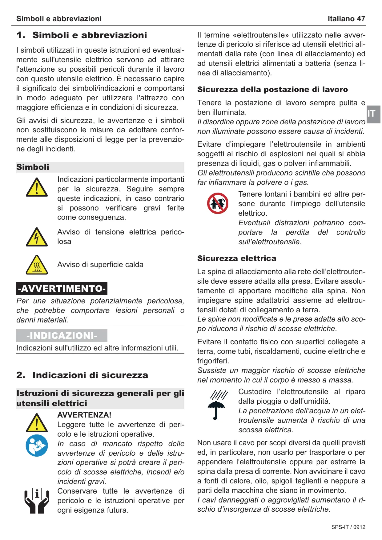 Istruzioni di sicurezza generali per gli utensili elettrici AVVERTENZA! Leggere tutte le avvertenze di pericolo e le istruzioni operative. In caso di mancato rispetto delle avvertenze di pericolo e delle istruzioni operative si potrà creare il pericolo di scosse elettriche, incendi e/o incidenti gravi. Conservare tutte le avvertenze di pericolo e le istruzioni operative per ogni esigenza futura. Italiano 47 Il termine «elettroutensile» utilizzato nelle avvertenze di pericolo si riferisce ad utensili elettrici alimentati dalla rete (con linea di allacciamento) ed ad utensili elettrici alimentati a batteria (senza linea di allacciamento). Sicurezza della postazione di lavoro Tenere la postazione di lavoro sempre pulita e ben illuminata. Il disordine oppure zone della postazione di lavoro non illuminate possono essere causa di incidenti. Evitare d’impiegare l’elettroutensile in ambienti soggetti al rischio di esplosioni nei quali si abbia presenza di liquidi, gas o polveri infiammabili. Gli elettroutensili producono scintille che possono far infiammare la polvere o i gas. Tenere lontani i bambini ed altre persone durante l’impiego dell’utensile elettrico. Eventuali distrazioni potranno comportare la perdita del controllo sull’elettroutensile. Sicurezza elettrica La spina di allacciamento alla rete dell’elettroutensile deve essere adatta alla presa. Evitare assolutamente di apportare modifiche alla spina. Non impiegare spine adattatrici assieme ad elettroutensili dotati di collegamento a terra. Le spine non modificate e le prese adatte allo scopo riducono il rischio di scosse elettriche. Evitare il contatto fisico con superfici collegate a terra, come tubi, riscaldamenti, cucine elettriche e frigoriferi. Sussiste un maggior rischio di scosse elettriche nel momento in cui il corpo è messo a massa. Custodire l’elettroutensile al riparo dalla pioggia o dall’umidità. La penetrazione dell’acqua in un elettroutensile aumenta il rischio di una scossa elettrica. Non usare il cavo per scopi diversi da quelli previsti ed, in particolare, non usarlo per trasportare o per appendere l’elettroutensile oppure per estrarre la spina dalla presa di corrente. Non avvicinare il cavo a fonti di calore, olio, spigoli taglienti e neppure a parti della macchina che siano in movimento. I cavi danneggiati o aggrovigliati aumentano il rischio d’insorgenza di scosse elettriche. SPS-IT / 0912 48 Italiano Indicazioni di sicurezza Qualora si voglia usare l’elettroutensile all’aperto, impiegare solo ed esclusivamente cavi di prolunga che siano adatti per l’impiego all’esterno. L’uso di un cavo di prolunga omologato per l’impiego all’esterno riduce il rischio d’insorgenza di scosse elettriche. Qualora non fosse possibile evitare di utilizzare l’elettroutensile in ambiente umido, utilizzare un IT interruttore di sicurezza. L’uso di un interruttore di sicurezza riduce il rischio di una scossa elettrica. Sicurezza delle persone È importante concentrarsi su ciò che si sta facendo e maneggiare con giudizio l’elettroutensile durante le operazioni di lavoro. Non utilizzare mai l’elettroutensile in caso di stanchezza oppure quando ci si trovi sotto l’effetto di droghe, bevande alcoliche e medicinali. Un attimo di distrazione durante l’uso dell’elettroutensile può essere causa di gravi incidenti. Indossare sempre equipaggiamento protettivo individuale, nonché guanti protettivi. Indossando abbigliamento di protezione personale come la maschera per polveri, scarpe di sicurezza che non scivolino, elmetto di protezione oppure protezione acustica seconda del tipo e dell’applicazione dell’elettroutensile, si riduce il rischio di incidenti. Evitare l’accensione involontaria dell’elettroutensile. Prima di collegarlo alla rete di alimentazione elettrica e/o alla batteria ricaricabile, prima di prenderlo oppure prima di iniziare a trasportarlo, assicurarsi che l’elettroutensile sia spento. Tenendo il dito sopra l’interruttore mentre si trasporta l’elettroutensile oppure collegandolo all’alimentazione di corrente con l’interruttore inserito, si vengono a creare situazioni pericolose in cui possono verificarsi seri incidenti. Prima di accendere l’elettroutensile togliere gli attrezzi di regolazione o la chiave inglese. Un accessorio oppure una chiave che si trovi in una parte rotante della macchina può provocare seri incidenti. Evitare una posizione anomala del corpo. Avere cura di mettersi in posizione sicura e di mantenere l’equilibrio in ogni situazione. In questo modo è possibile controllare meglio l’elettroutensile in caso di situazioni inaspettate. Indossare vestiti adeguati. Non indossare vestiti larghi, né portare bracciali e catenine. Tenere i capelli, i vestiti ed i guanti lontani da pezzi in movimento. Vestiti lenti, gioielli o capelli lunghi potranno impigliarsi in pezzi in movimento. In caso fosse previsto il montaggio di dispositivi di aspirazione della polvere e di raccolta, assicurarsi che gli stessi siano collegati e che vengano utilizzati correttamente. L’utilizzo di un’aspirazione polvere può ridurre lo svilupparsi di situazioni pericolose dovute alla polvere. Trattamento accurato ed uso corretto degli elettroutensili Non sottoporre la macchina a sovraccarico. Per il proprio lavoro, utilizzare esclusivamente l’elettroutensile esplicitamente previsto per il caso. Con un elettroutensile adatto si lavora in modo migliore e più sicuro nell’ambito della sua potenza di prestazione. Non utilizzare mai elettroutensili con interruttori difettosi. Un elettroutensile con l’interruttore rotto è pericoloso e deve essere aggiustato. Prima di procedere ad operazioni di regolazione sulla macchina, prima di sostituire parti accessorie oppure prima di posare la macchina al termine di un lavoro, estrarre sempre la spina dalla presa della corrente e/o estrarre la batteria ricaricabile. Tale precauzione eviterà che l’elettroutensile possa esser