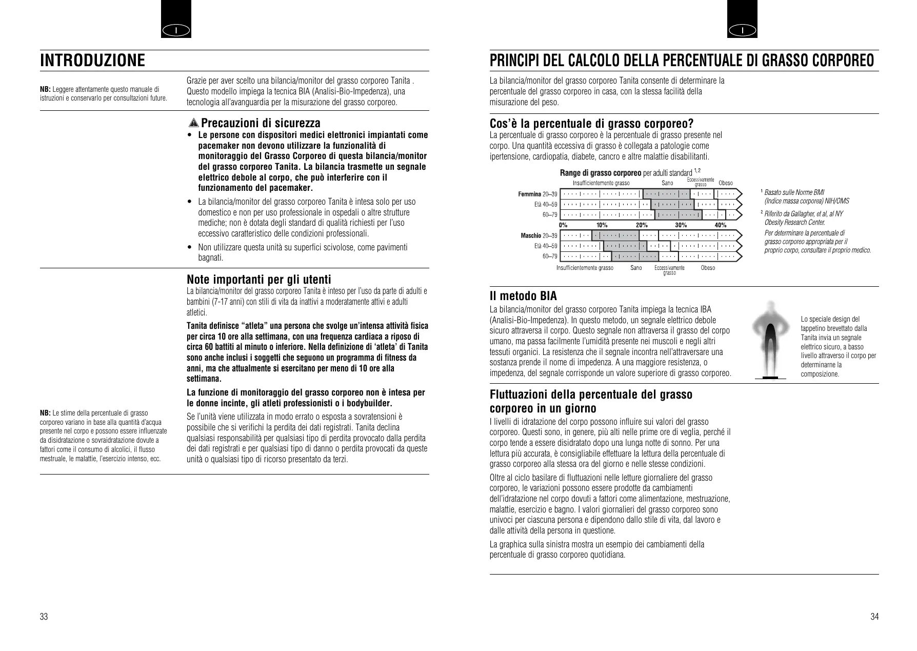INTRODUZIONE PRINCIPI DEL CALCOLO DELLA PERCENTUALE DI GRASSO CORPOREO NB: Leger attentamente questo manuale di istuziont conservarlo per consultzioni future Grazie per aver scelto una bilancia/monitor del grasso corporeo Tanita Questo modello impiega la tecnica BIA (Analisi-Bio-Impedenza), una tecnologia all'avanguardia per la misurazione del grasso corporeo. à Precauzioni di sicurezza + Le persone con dispositori medici elettronici impiantati come pacemaker non devono utilizzare la funzionalità di monitoraggio del Grasso Corporeo di questa bilancia/monitor del grasso corporeo Tanita. La bilancia trasmette un segnale elettrico debole al corpo, che puà interferire con il funzionamento del pacemaker. La bilancia/monitor del grasso corporeo Tanita à intesa solo per uso domestico e non per uso professionale in ospedali o altre strutture mediche; non è dotata degli standard di qualità richiesti per l'uso eccessivo caratteristico delle condizioni professional Non utilizzare questa unità su superfici scivolose, come pavimenti bagnati. NB: Le sfime della percentuale di grasso corporeo variano in base alla quantità d'acqua presente nel corpo & possono essere inlluenzale da disidratzzione 0 sovreidralazione dovute à fatori come il consumo di alcolici, i flusso mestuale, le malt, l'serciio intenso, ecc. Note importanti per gli utenti La bilancia/monitor del grasso corporeo Tanita è inteso per l'uso da parte di adulti e bambini (7-17 anni) con stili di vita da inattivi a moderatamente attivi e adulti atletici Tanita definisce “atleta” una persona che svolge un’intensa attività fisica per circa 10 ore alla settimana, con una frequenza cardiaca a riposo di circa 60 battiti al minuto o inferiore. Nella definizione di ‘atleta’ di Tanita sono anche inclusi i soggetti che seguono un programma di fitness da anni, ma che attualmente si esercitano per meno di 10 ore alla settimana. La funzione di monitoraggio del grasso corporeo non è intesa per le donne incinte, gli atleti professionisti o i bodybuilder. Se l'unità viene utilizzata in modo errato o esposta a sovratensioni à possibile che si verifichi la perdita dei dati registrati. Tanita declina qualsiasi responsabilità per qualsiasi tipo di perdita provocato dalla perdita dei dati registrati e per qualsiasi tipo di danno o perdita provocati da queste unità o qualsiasi tipo di ricorso presentato da terzi