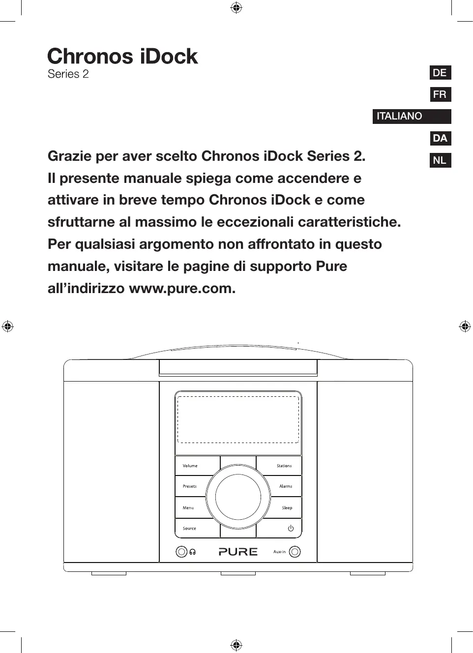 Grazie per aver scelto Chronos iDock Series 2. Il presente manuale spiega come accendere e attivare in breve tempo Chronos iDock e come sfruttarne al massimo le eccezionali caratteristiche. Per qualsiasi argomento non affrontato in questo manuale, visitare le pagine di supporto Pure all’indirizzo www.pure.com.