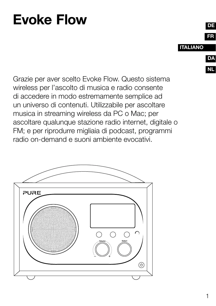 Evoke Flow ITALIANO [DA Grazie per aver scelto Evoke Flow. Questo sistema wireless per l’ascolto di musica e radio consente di accedere in modo estremamente semplice ad un universo di contenuti. Utilizzabile per ascoltare musica in streaming wireless da PC o Mac; per ascoltare qualunque stazione radio internet, digitale o FM: e per riprodurre migliaia di podcast, programmi radio on-demand e suoni ambiente evocativi.