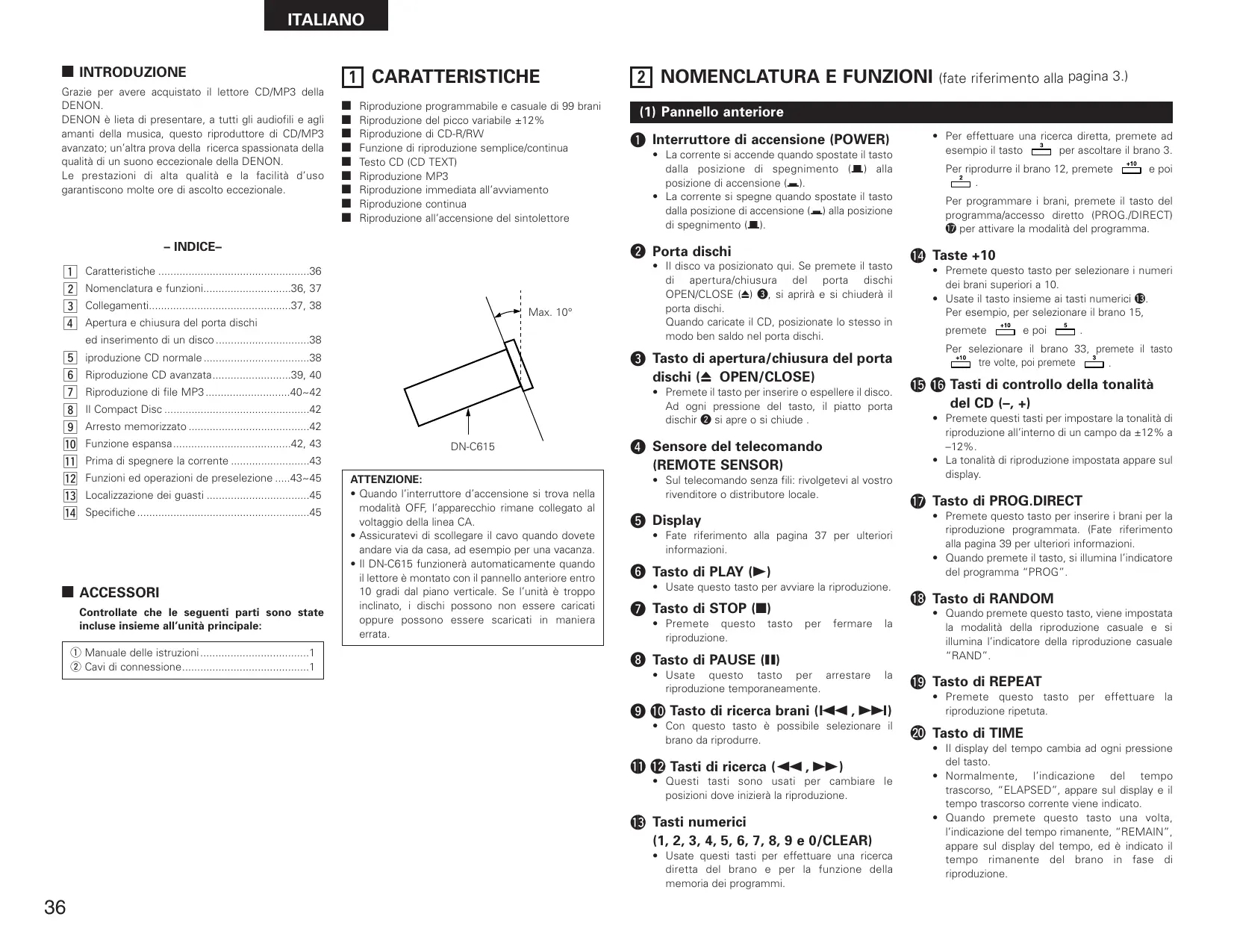 Nomenclatura e funzioni.............................36, 37 Collegamenti...............................................37, 38 Max. 10° Apertura e chiusura del porta dischi q Interruttore di accensione (POWER)