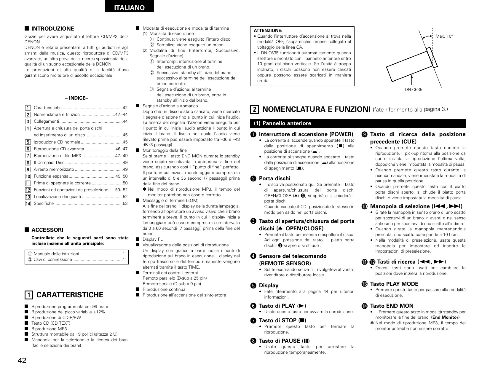 - Il DN-C635 funzionerà automaticamente quando il lettore è montato con il pannello anteriore entro 10 gradi dal piano verticale. Se l’unità è troppo inclinato, i dischi possono non essere caricati oppure possono essere scaricati in maniera errata. Max. 10° DN-C635
