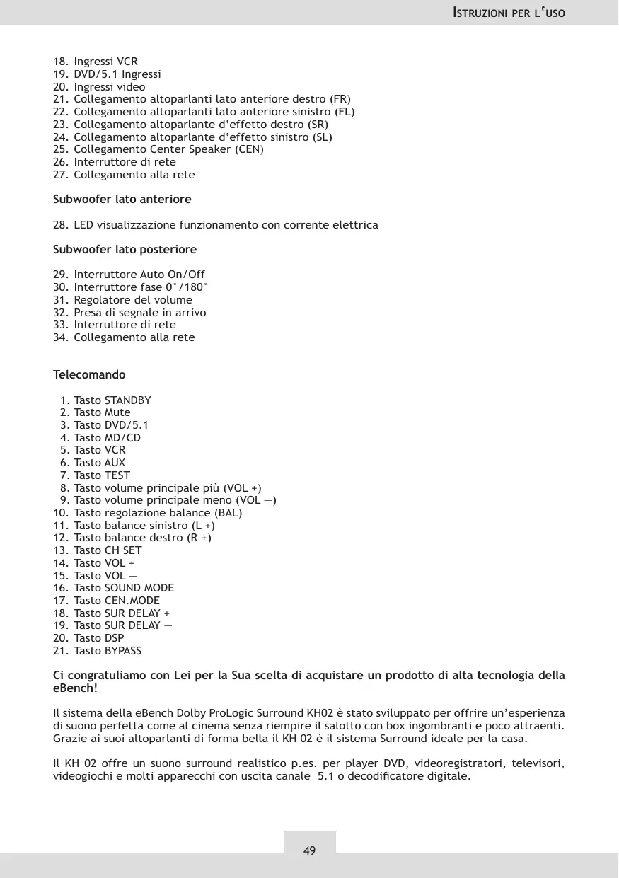 Tasto STANDBY Tasto Mute Tasto DVD/5.1 Tasto MD/CD Tasto VCR Tasto AUX Tasto TEST Tasto volume principale più (VOL +) Tasto volume principale meno (VOL —) Tasto regolazione balance (BAL) Tasto balance sinistro (L +) Tasto balance destro (R +) Tasto CH SET Tasto VOL + Tasto VOL — Tasto SOUND MODE Tasto CEN.MODE Tasto SUR DELAY + Tasto SUR DELAY — Tasto DSP Tasto BYPASS Ci congratuliamo con Lei per la Sua scelta di acquistare un prodotto di alta tecnologia della eBench! Il sistema della eBench Dolby ProLogic Surround KH02 è stato sviluppato per offrire un’esperienza di suono perfetta come al cinema senza riempire il salotto con box ingombranti e poco attraenti. Grazie ai suoi altoparlanti di forma bella il KH 02 è il sistema Surround ideale per la casa. Il KH 02 offre un suono surround realistico p.es. per player DVD, videoregistratori, televisori, videogiochi e molti apparecchi con uscita canale 5.1 o decodicatore digitale.