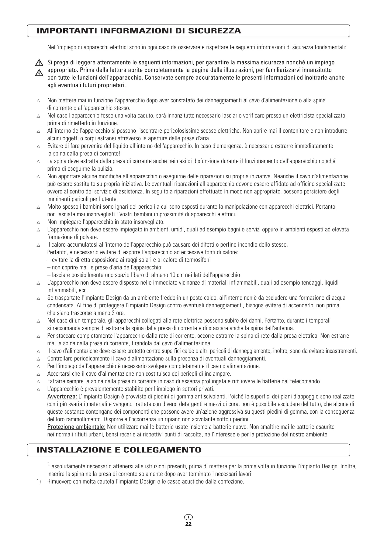 Ne pas mettre l'appareil en service si la prise, le cordon ou l'appareil sont endommagés. Si l'appareil est tombé, le faire contrôler au préalable par un électricien spécialisé avant de le remettre en service. L'intérieur de l'appareil est soumis à des tensions dangereuses. Ne jamais ouvrir le boîtier ni introduire des objets par les trous d'aérations. Evitez de faire pénétrer des liquides dans l'appareil. Si nécessaire, débrancher la prise. Débranchez également la prise de la prise murale en cas d'apparition de défauts pendant le fonctionnement de l'appareil et avant de nettoyer l'appareil. Ne procédez vous-même à aucunes modifications ni réparations de l'appareil. De même, ne remplacez pas vous-même le cordon de raccordement. Ne faites procéder à toutes réparations de l'appareil ou du cordon de raccordement que par un atelier spécialisé ou un centre SAV. Toute réparation incorrecte peut être la source de dangers importants pour l'utilisateur. Les enfants sous-estiment souvent les dangers lors de la manipulation d'appareils électriques. Ne laissez donc jamais des enfants à proximité d'appareils électriques sans surveillance. Ne laissez pas l'appareil sans surveillance pendant le fonctionnement. Ne pas utiliser l'appareil dans les lieux humides (par exemple salles de bain) ou soumis à une poussière importante. La chaleur accumulée à l'intérieur de l'appareil peut entraîner une panne ou un incendie. N'exposez donc pas l'appareil à des températures extrêmes: – éviter les rayons directs du soleil et la chaleur du chauffage – ne pas boucher ou recouvrir les fentes d'aération de l'appareil – dans la mesure du possible, laisser 10 cm de libre par rapport aux côtés de l'appareil Ne pas installer l'appareil à proximité immédiate de matériaux inflammables (par exemple rideaux, liquides inflammables etc...). Si la chaîne est transportée d'un lieu froid dans un lieu chaud (par exemple après le transport), il peut se former une condensation à l'intérieur. Pour ne pas endommager la chaîne, attendre au moins 2 heures avant de la mettre en marche. Lors d'un orage, les appareils raccordés au secteur peuvent être endommagés. En cas d'orage, débranchez donc la prise de la prise murale et débranchez également la prise de l'antenne. Pour que l'appareil soit coupé complètement de l'alimentation électrique, il faut absolument débrancher la prise de la prise murale. Ce faisant, saisir la prise et jamais le cordon. Protégez le cordon de raccordement de tout contact avec des surfaces chaudes et de tous autres endommagements et veillez à ne pas le coincer. Contrôlez régulièrement le cordon de raccordement en vue de détecter d'éventuels endommagements. Lors de l'utilisation, déroulez complètement le cordon. Veillez à ce qu'il ne soit pas possible de trébucher sur le cordon de raccordement. En cas d'absence prolongée, débrancher la prise et retirer les piles de la télécommande. L'appareil est conçu pour un usage domestique. Avis: La chaîne est équipée de pieds en caoutchouc antidérapants. Etant donné que les sols peuvent être constitués des matériaux les plus divers et traités avec les produits d'entretien les plus divers, il ne peut être entièrement exclu que certaines de ces substances contiennent des composants susceptibles d'attaquer et de ramollir les pieds en caoutchouc. Le cas échéant, posez un support antidérapant sous les pieds. Protection de l'environnement: Ne jamais mélanger des piles usagées et des piles neuves. Dans l'intérêt de notre environnement, n'éliminez pas les piles usagées dans les ordures ménagères, mais remettez-les à des centres de collecte correspondants.