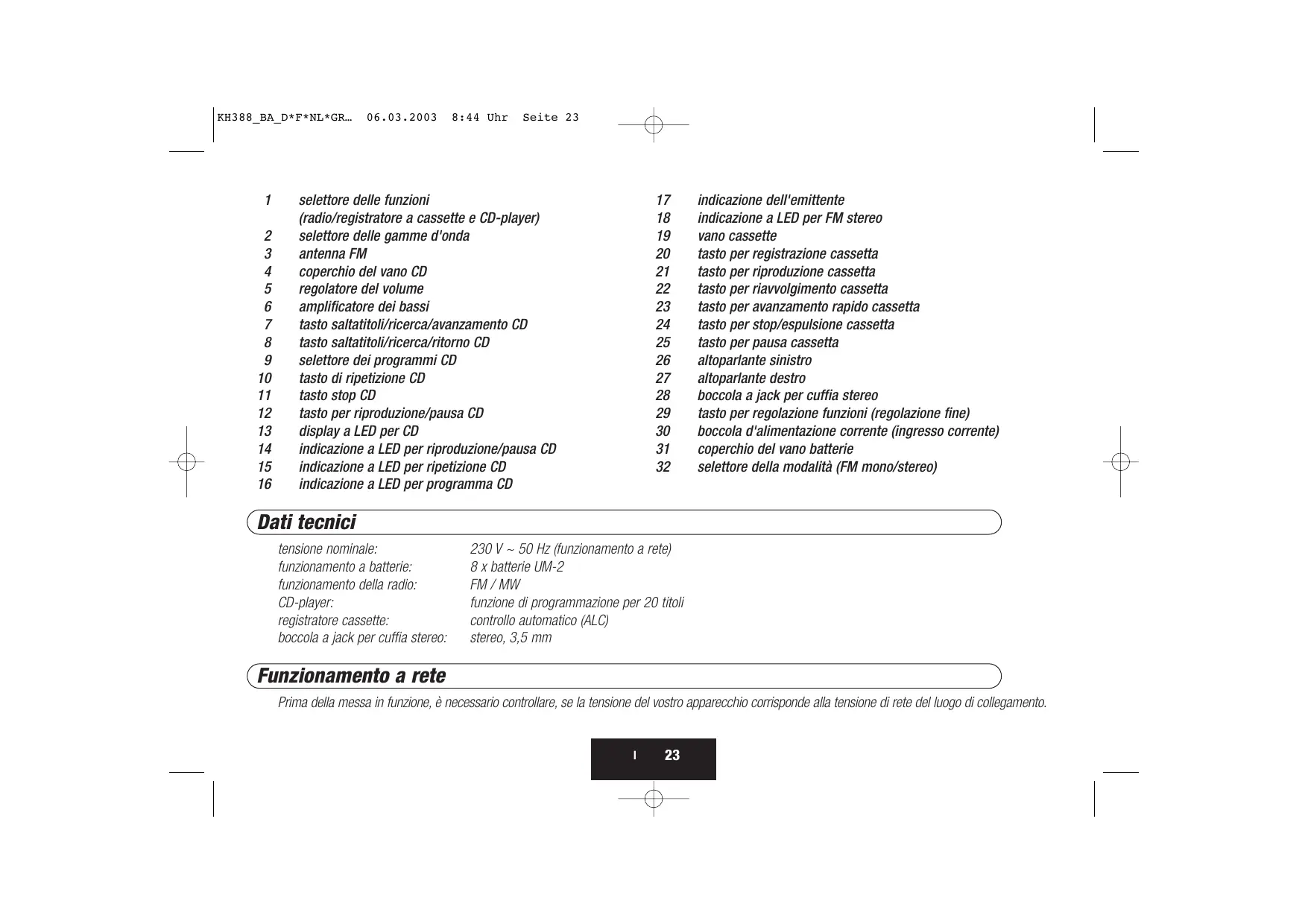 Tensión de la red: Servicio con batería: Servicio de radio: Lector de CD: Grabadora de cassette: Hembrilla auriculares: