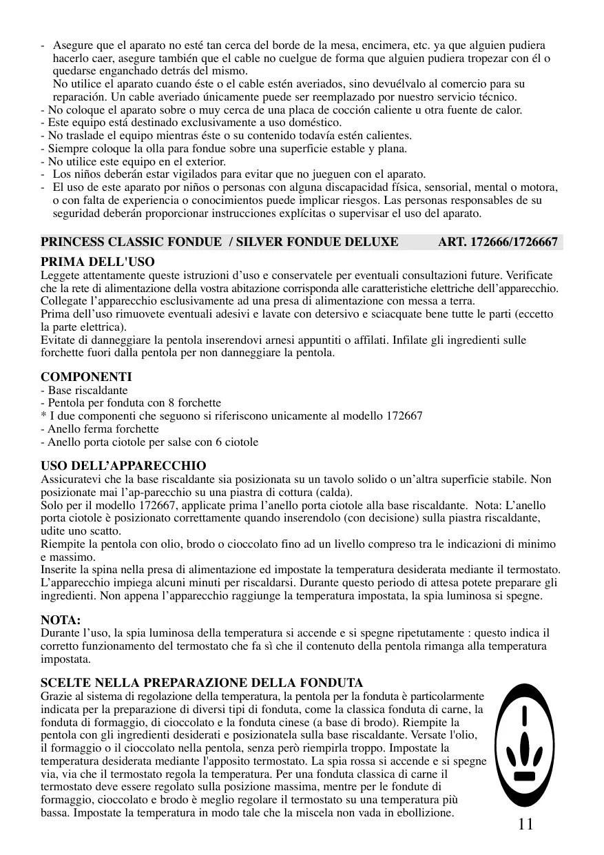 ART. 172666/1726667 PRIMA DELL'USO Leggete attentamente queste istruzioni d’uso e conservatele per eventuali consultazioni future. Verificate che la rete di alimentazione della vostra abitazione corrisponda alle caratteristiche elettriche dell’apparecchio. Collegate l’apparecchio esclusivamente ad una presa di alimentazione con messa a terra. Prima dell’uso rimuovete eventuali adesivi e lavate con detersivo e sciacquate bene tutte le parti (eccetto la parte elettrica). Evitate di danneggiare la pentola inserendovi arnesi appuntiti o affilati. Infilate gli ingredienti sulle forchette fuori dalla pentola per non danneggiare la pentola. COMPONENTI - Base riscaldante - Pentola per fonduta con 8 forchette