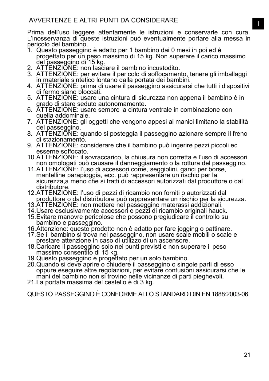 esserne soffocato. 10.ATTENZIONE: il sovraccarico, la chiusura non corretta e l’uso di accessori non omologati può causare il danneggiamento o la rottura del passeggino. 11.ATTENZIONE: l’uso di accessori come, seggiolini, ganci per borse, mantelline parapioggia, ecc. può rappresentare un rischio per la sicurezza,a meno che si tratti di accessori autorizzati dal produttore o dal distributore. 12.ATTENZIONE: l’uso di pezzi di ricambio non forniti o autorizzati dal produttore o dal distributore può rappresentare un rischio per la sicurezza. 13.ATTENZIONE: non mettere nel passeggino materassi addizionali. 14.Usare esclusivamente accessori e pezzi di ricambio originali hauck. 15.Evitare manovre pericolose che possono pregiudicare il controllo su bambino e passeggino. 16.Attenzione: questo prodotto non è adatto per fare jogging o pattinare. 17.Se il bambino si trova nel passeggino, non usare scale mobili o scale e prestare attenzione in caso di utilizzo di un ascensore. 18.Caricare il passeggino solo nei punti previsti e non superare il peso massimo consentito di 15 kg. 19.Questo passeggino è progettato per un solo bambino. 20.Quando si deve aprire o chiudere il passeggino o singole parti di esso oppure eseguire altre regolazioni, per evitare contusioni assicurarsi che le mani del bambino non si trovino nelle vicinanze di parti pieghevoli. 21.La portata massima del cestello è di 3 kg. QUESTO PASSEGGINO È CONFORME ALLO STANDARD DIN EN 1888:2003-06.