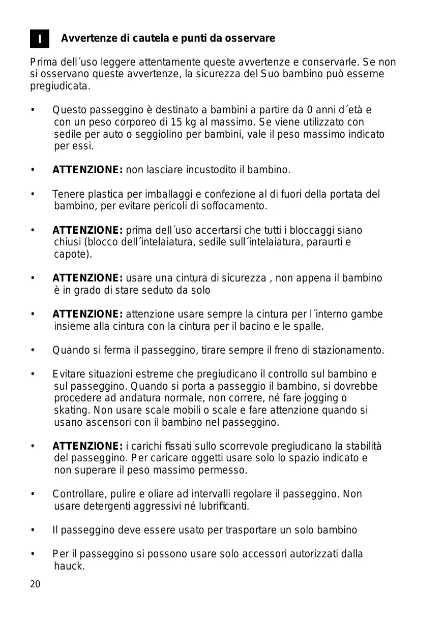 I Per favore usare solo accessori originali hauck e pezzi di ricambio originali hauck. QUESTO PASSEGGINO È CONFORME ALLA NORMA : DIN EN 1888: 2003-6