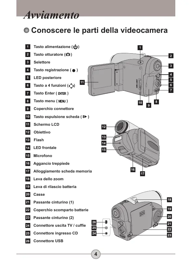 Conoscere le parti della videocamera 4 Caricamento delle batterie 5 Inserimento di una scheda memoria (optional) 6 Attaccare il cinturino (optional) 8 Come tenere la videocamera 9 Come aprire il coperchio del connettore 9 Utilizzo del treppiede (optional) 10