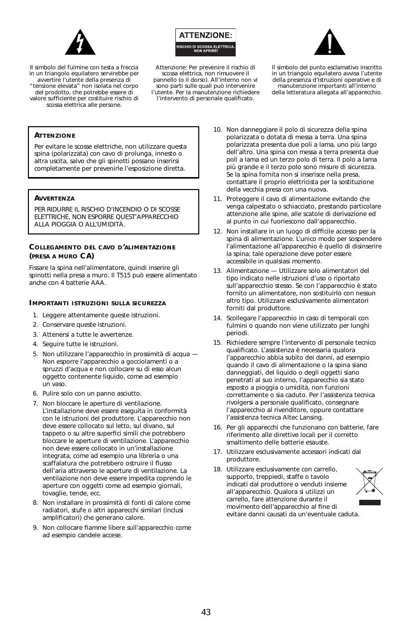 15. Richiedere sempre l’intervento di personale tecnico qualificato. L’assistenza è necessaria qualora l’apparecchio abbia subito dei danni, ad esempio quando il cavo di alimentazione o la spina siano danneggiati, del liquido o degli oggetti siano penetrati al suo interno, l’apparecchio sia stato esposto a pioggia o umidità, non funzioni correttamente o sia caduto. Per l’assistenza tecnica rivolgersi a personale qualificato, consegnare l’apparecchio al rivenditore, oppure contattare l’assistenza tecnica Altec Lansing.