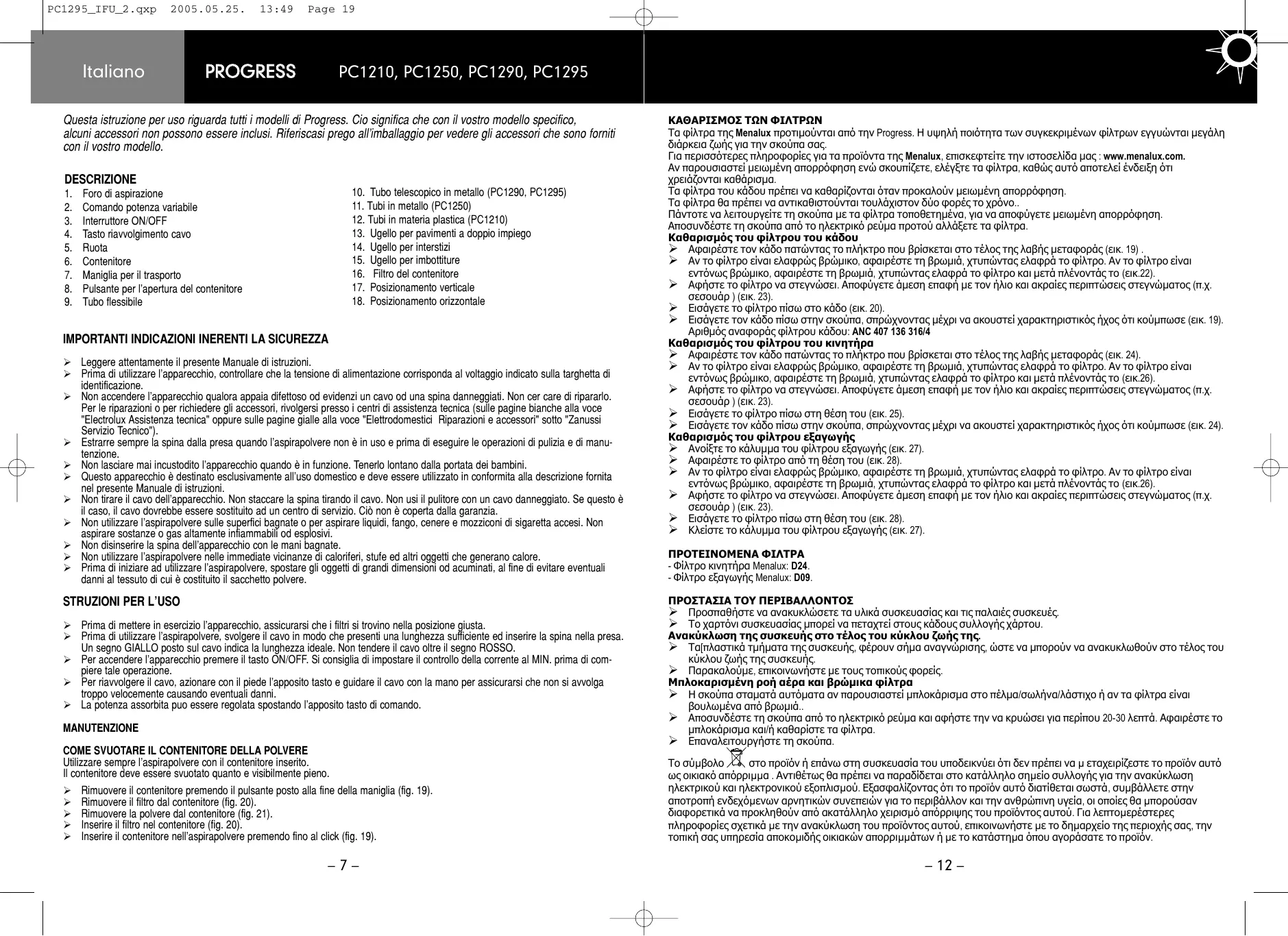 Italiano 13:49 Page 19 PROGRESS PC1210, PC1250, PC1290, PC1295 Questa istruzione per uso riguarda tutti i modelli di Progress. Cio significa che con il vostro modello specifico, alcuni accessori non possono essere inclusi. Riferiscasi prego all'imballaggio per vedere gli accessori che sono forniti con il vostro modello. DESCRIZIONE