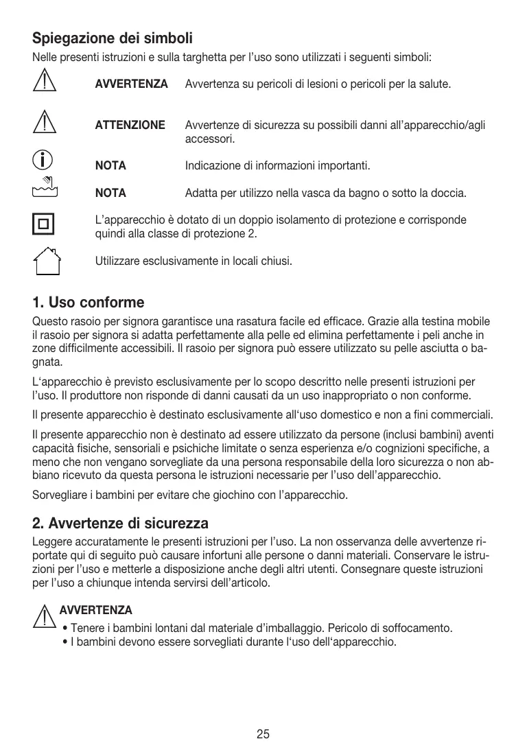 1. Uso conforme Questo rasoio per signora garantisce una rasatura facile ed efficace. Grazie alla testina mobile il rasoio per signora si adatta perfettamente alla pelle ed elimina perfettamente i peli anche in zone difficilmente accessibili. Il rasoio per signora può essere utilizzato su pelle asciutta o bagnata. L‘apparecchio è previsto esclusivamente per lo scopo descritto nelle presenti istruzioni per l’uso. Il produttore non risponde di danni causati da un uso inappropriato o non conforme. Il presente apparecchio è destinato esclusivamente all‘uso domestico e non a fini commerciali. Il presente apparecchio non è destinato ad essere utilizzato da persone (inclusi bambini) aventi capacità fisiche, sensoriali e psichiche limitate o senza esperienza e/o cognizioni specifiche, a meno che non vengano sorvegliate da una persona responsabile della loro sicurezza o non abbiano ricevuto da questa persona le istruzioni necessarie per l’uso dell’apparecchio. Sorvegliare i bambini per evitare che giochino con l’apparecchio.