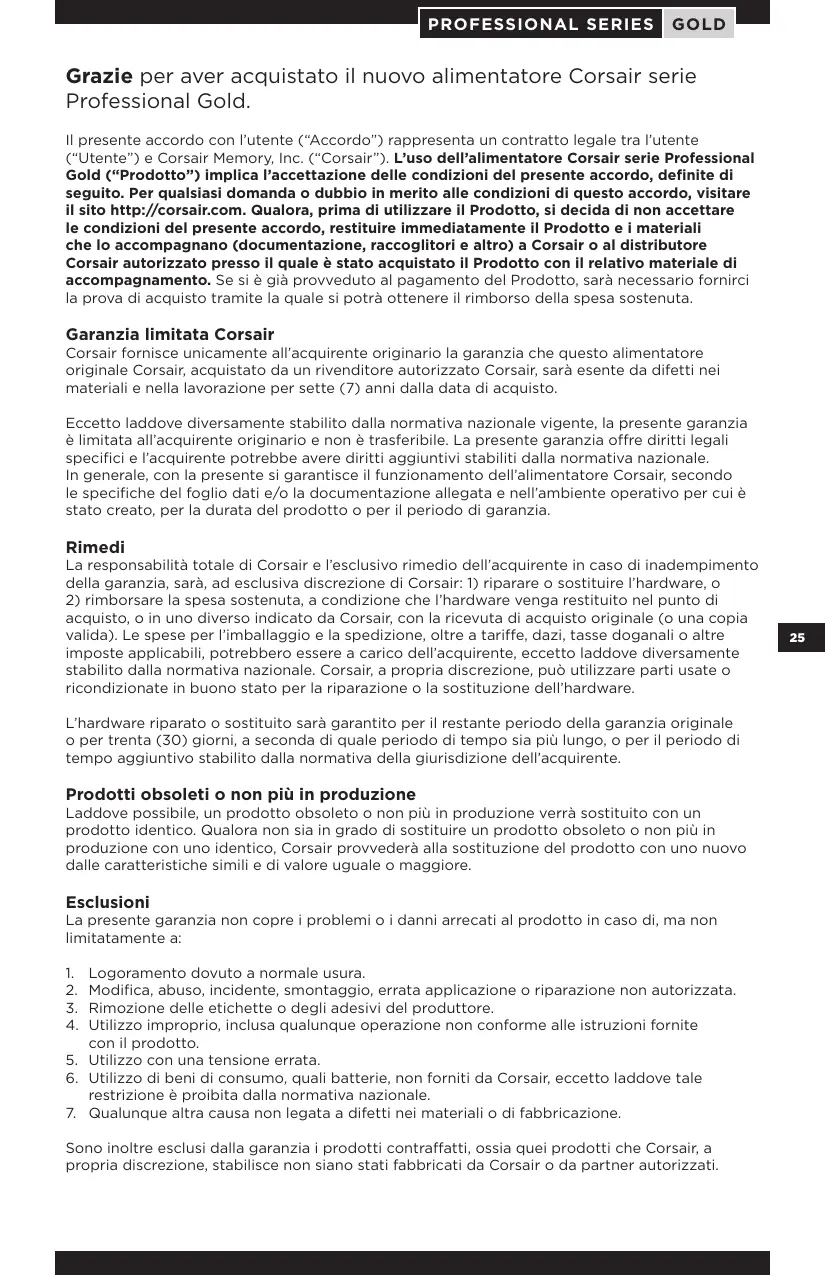 R 51318.22-99 R 51318.24-99 R 51317.3.2-2006 R 51317.3.3-99 ROHS 2002/95/EC, Richtlinie zur Beschränkung der Verwendung bestimmter gefährlicher Stoffe in Elektro- und Elektronikgeräten WEEE 2002/96/EC, Richtlinie über Elektro- und Elektronik-Altgeräte ROHS (China) China Order No. 39, „Administration on the Control of Pollution Caused By Electronic Information Products“ (Gesetz zur Eindämmung der Umweltverschmutzung durch informationsverarbeitende Elektrogeräte) PROFESSIONAL SERIES GOLD Grazie per aver acquistato il nuovo alimentatore Corsair serie Professional Gold. Il presente accordo con l’utente (“Accordo”) rappresenta un contratto legale tra l’utente (“Utente”) e Corsair Memory, Inc. (“Corsair”). L’uso dell’alimentatore Corsair serie Professional Gold (“Prodotto”) implica l’accettazione delle condizioni del presente accordo, definite di seguito. Per qualsiasi domanda o dubbio in merito alle condizioni di questo accordo, visitare il sito http://corsair.com. Qualora, prima di utilizzare il Prodotto, si decida di non accettare le condizioni del presente accordo, restituire immediatamente il Prodotto e i materiali che lo accompagnano (documentazione, raccoglitori e altro) a Corsair o al distributore Corsair autorizzato presso il quale è stato acquistato il Prodotto con il relativo materiale di accompagnamento. Se si è già provveduto al pagamento del Prodotto, sarà necessario fornirci la prova di acquisto tramite la quale si potrà ottenere il rimborso della spesa sostenuta. Garanzia limitata Corsair Corsair fornisce unicamente all’acquirente originario la garanzia che questo alimentatore originale Corsair, acquistato da un rivenditore autorizzato Corsair, sarà esente da difetti nei materiali e nella lavorazione per sette (7) anni dalla data di acquisto. Eccetto laddove diversamente stabilito dalla normativa nazionale vigente, la presente garanzia è limitata all’acquirente originario e non è trasferibile. La presente garanzia offre diritti legali specifici e l’acquirente potrebbe avere diritti aggiuntivi stabiliti dalla normativa nazionale. In generale, con la presente si garantisce il funzionamento dell’alimentatore Corsair, secondo le specifiche del foglio dati e/o la documentazione allegata e nell’ambiente operativo per cui è stato creato, per la durata del prodotto o per il periodo di garanzia. Rimedi La responsabilità totale di Corsair e l’esclusivo rimedio dell’acquirente in caso di inadempimento della garanzia, sarà, ad esclusiva discrezione di Corsair: 1) riparare o sostituire l’hardware, o