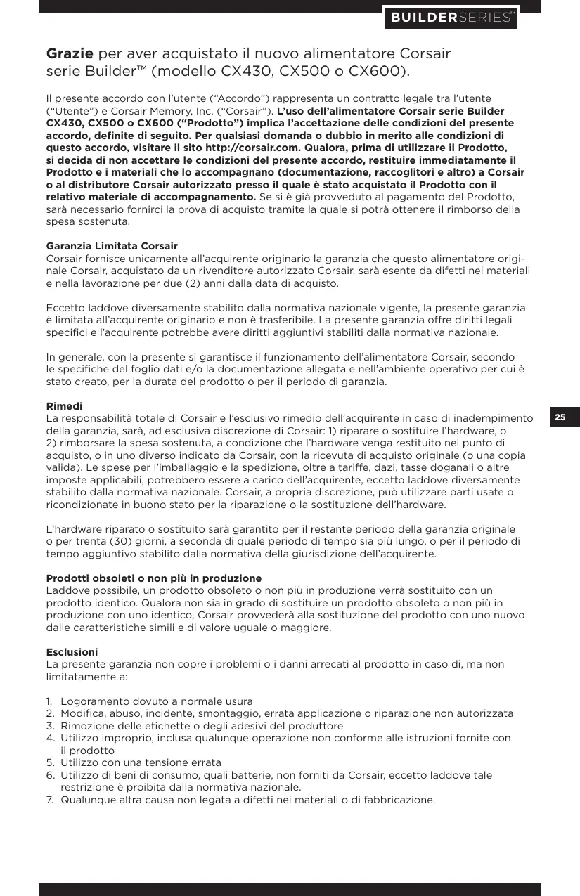 R 51318.22-99 R 51318.24-99 R 51317.3.2-2006 R 51317.3.3-99 ROHS 2002/95/EC, Richtlinie zur Beschränkung der Verwendung bestimmter gefährlicher Stoffe in Elektround Elektronikgeräten BUILDERSERIES™ Grazie per aver acquistato il nuovo alimentatore Corsair serie Builder™ (modello CX430, CX500 o CX600). Il presente accordo con l’utente (“Accordo”) rappresenta un contratto legale tra l’utente (“Utente”) e Corsair Memory, Inc. (“Corsair”). L’uso dell’alimentatore Corsair serie Builder CX430, CX500 o CX600 (“Prodotto”) implica l’accettazione delle condizioni del presente accordo, definite di seguito. Per qualsiasi domanda o dubbio in merito alle condizioni di questo accordo, visitare il sito http://corsair.com. Qualora, prima di utilizzare il Prodotto, si decida di non accettare le condizioni del presente accordo, restituire immediatamente il Prodotto e i materiali che lo accompagnano (documentazione, raccoglitori e altro) a Corsair o al distributore Corsair autorizzato presso il quale è stato acquistato il Prodotto con il relativo materiale di accompagnamento. Se si è già provveduto al pagamento del Prodotto, sarà necessario fornirci la prova di acquisto tramite la quale si potrà ottenere il rimborso della spesa sostenuta. Garanzia Limitata Corsair Corsair fornisce unicamente all’acquirente originario la garanzia che questo alimentatore originale Corsair, acquistato da un rivenditore autorizzato Corsair, sarà esente da difetti nei materiali e nella lavorazione per due (2) anni dalla data di acquisto. Eccetto laddove diversamente stabilito dalla normativa nazionale vigente, la presente garanzia è limitata all’acquirente originario e non è trasferibile. La presente garanzia offre diritti legali specifici e l’acquirente potrebbe avere diritti aggiuntivi stabiliti dalla normativa nazionale. In generale, con la presente si garantisce il funzionamento dell’alimentatore Corsair, secondo le specifiche del foglio dati e/o la documentazione allegata e nell’ambiente operativo per cui è stato creato, per la durata del prodotto o per il periodo di garanzia. Rimedi La responsabilità totale di Corsair e l’esclusivo rimedio dell’acquirente in caso di inadempimento della garanzia, sarà, ad esclusiva discrezione di Corsair: 1) riparare o sostituire l’hardware, o