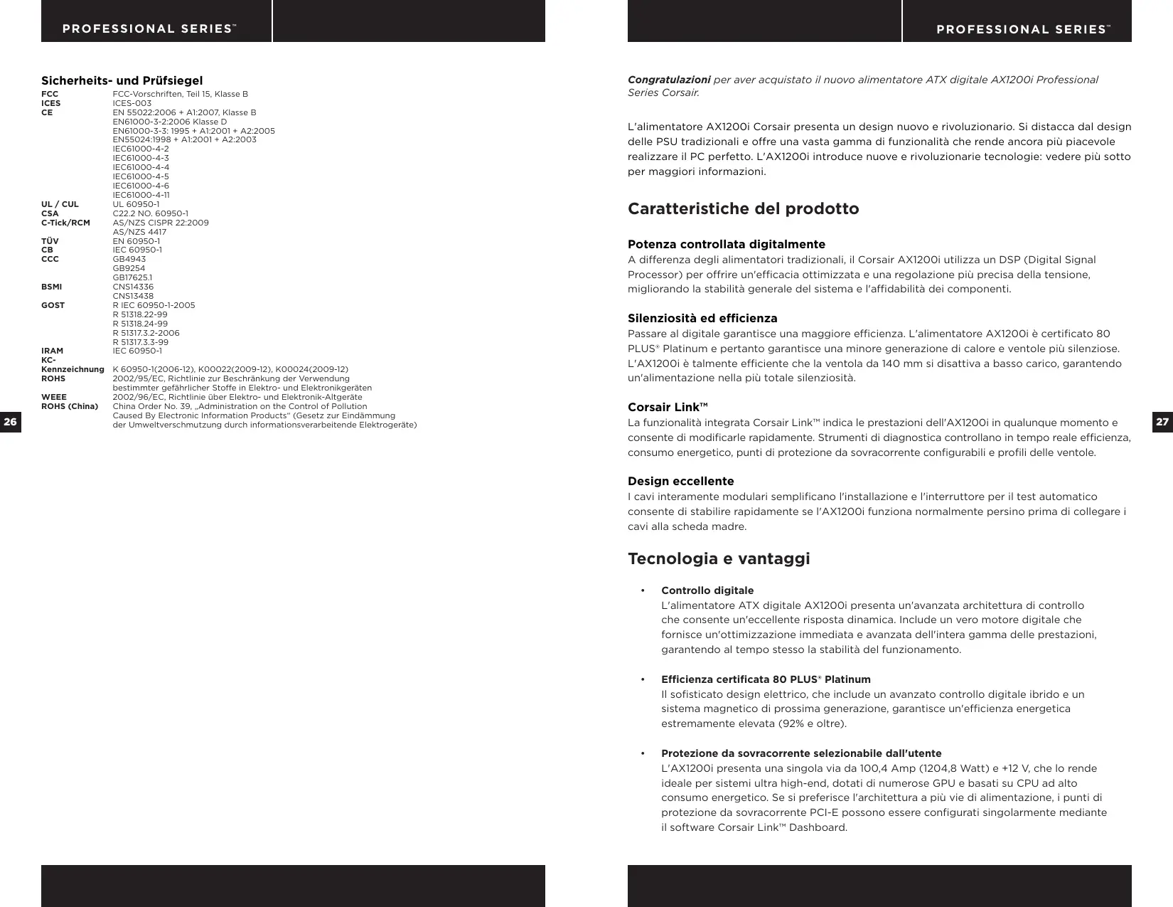 R 51318.22-99 R 51318.24-99 R 51317.3.2-2006 R 51317.3.3-99 IEC 60950-1 K 60950-1(2006-12), K00022(2009-12), K00024(2009-12) 2002/95/EC, Richtlinie zur Beschränkung der Verwendung bestimmter gefährlicher Stoffe in Elektro- und Elektronikgeräten 2002/96/EC, Richtlinie über Elektro- und Elektronik-Altgeräte China Order No. 39, „Administration on the Control of Pollution Caused By Electronic Information Products“ (Gesetz zur Eindämmung der Umweltverschmutzung durch informationsverarbeitende Elektrogeräte) P R O F E S S I O N A L S E R I E S™ Congratulazioni per aver acquistato il nuovo alimentatore ATX digitale AX1200i Professional Series Corsair. L'alimentatore AX1200i Corsair presenta un design nuovo e rivoluzionario. Si distacca dal design delle PSU tradizionali e offre una vasta gamma di funzionalità che rende ancora più piacevole realizzare il PC perfetto. L'AX1200i introduce nuove e rivoluzionarie tecnologie: vedere più sotto per maggiori informazioni. Caratteristiche del prodotto Potenza controllata digitalmente A differenza degli alimentatori tradizionali, il Corsair AX1200i utilizza un DSP (Digital Signal Processor) per offrire un'efficacia ottimizzata e una regolazione più precisa della tensione, migliorando la stabilità generale del sistema e l'affidabilità dei componenti. Silenziosità ed efficienza Passare al digitale garantisce una maggiore efficienza. L'alimentatore AX1200i è certificato 80 PLUS® Platinum e pertanto garantisce una minore generazione di calore e ventole più silenziose. L'AX1200i è talmente efficiente che la ventola da 140 mm si disattiva a basso carico, garantendo un'alimentazione nella più totale silenziosità. Corsair Link™ La funzionalità integrata Corsair Link™ indica le prestazioni dell'AX1200i in qualunque momento e consente di modificarle rapidamente. Strumenti di diagnostica controllano in tempo reale efficienza, consumo energetico, punti di protezione da sovracorrente configurabili e profili delle ventole. Design eccellente I cavi interamente modulari semplificano l'installazione e l'interruttore per il test automatico consente di stabilire rapidamente se l'AX1200i funziona normalmente persino prima di collegare i cavi alla scheda madre. Tecnologia e vantaggi