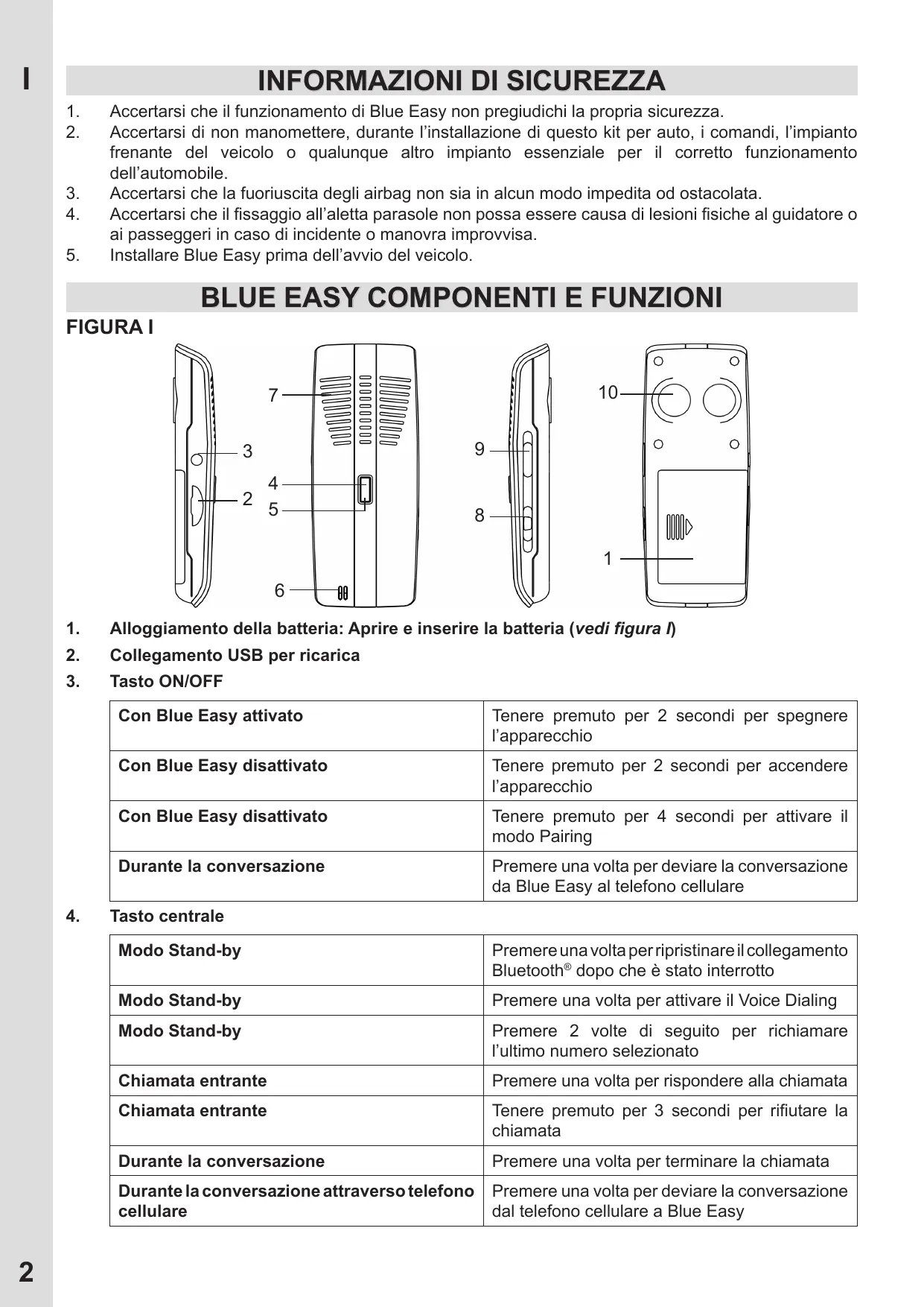Blue Easy si spegne automaticamenteanche nel caso di assenza di collegamento Bluetooth fra Blue Easy e un altro appearecchio cellulare per altre 10 minuti.