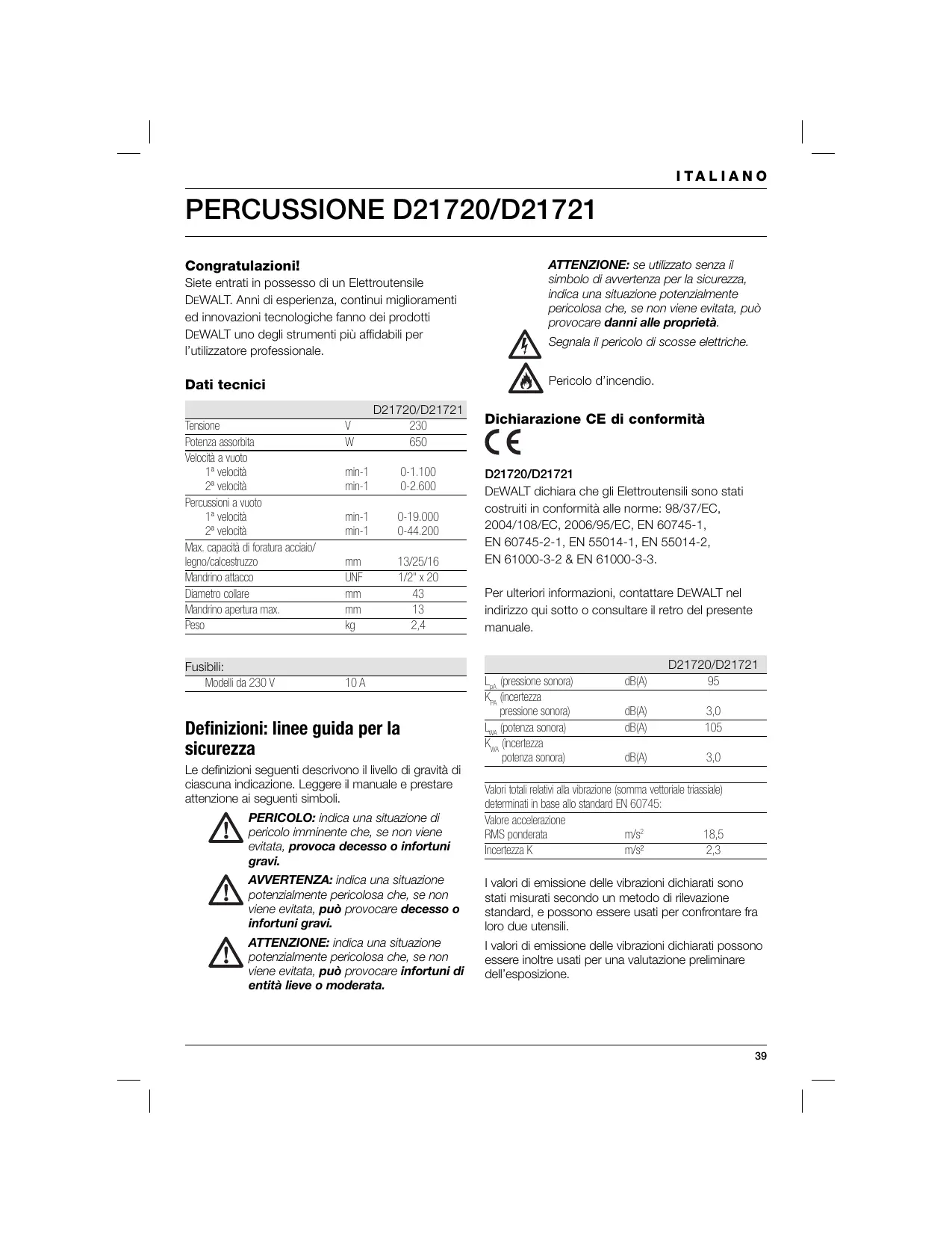 Congratulazioni! Siete entrati in possesso di un Elettroutensile DEWALT. Anni di esperienza, continui miglioramenti ed innovazioni tecnologiche fanno dei prodotti DEWALT uno degli strumenti più affidabili per l’utilizzatore professionale. Fusibili: Modelli da 230 V Segnala il pericolo di scosse elettriche. Pericolo d’incendio. Dati tecnici Tensione Potenza assorbita Velocità a vuoto 1ª velocità 2ª velocità Percussioni a vuoto 1ª velocità 2ª velocità Max. capacità di foratura acciaio/ legno/calcestruzzo Mandrino attacco Diametro collare Mandrino apertura max. Peso ATTENZIONE: se utilizzato senza il simbolo di avvertenza per la sicurezza, indica una situazione potenzialmente pericolosa che, se non viene evitata, può provocare danni alle proprietà.
