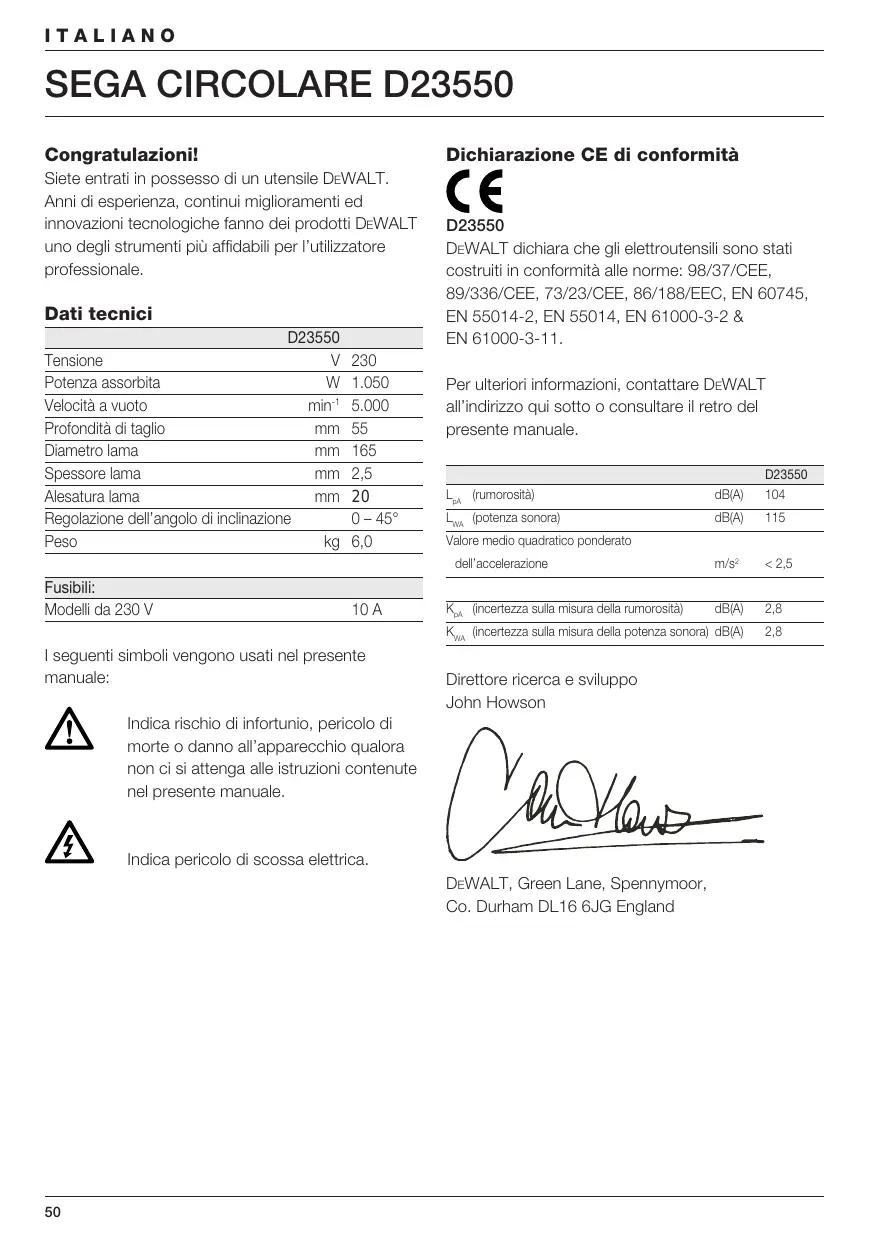 Congratulazioni! Dichiarazione CE di conformità Siete entrati in possesso di un utensile DEWALT. Anni di esperienza, continui miglioramenti ed innovazioni tecnologiche fanno dei prodotti DEWALT uno degli strumenti più affidabili per l’utilizzatore professionale. Dati tecnici D23550 Tensione Potenza assorbita Velocità a vuoto min-1 Profondità di taglio Diametro lama Spessore lama Alesatura lama Regolazione dell’angolo di inclinazione Peso