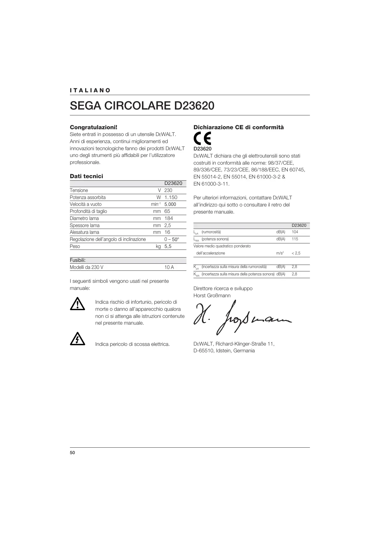 D23620 DEWALT dichiara che gli elettroutensili sono stati costruiti in conformità alle norme: 98/37/CEE, 89/336/CEE, 73/23/CEE, 86/188/EEC, EN 60745, EN 55014-2, EN 55014, EN 61000-3-2 & EN 61000-3-11. Per ulteriori informazioni, contattare DEWALT all’indirizzo qui sotto o consultare il retro del presente manuale. D23620 LpA (rumorosità) dB(A)
